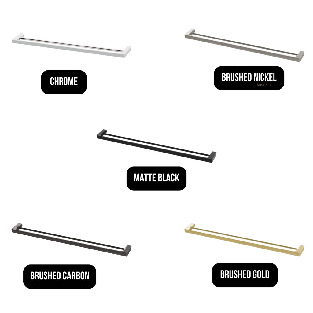 Elevate your bathroom's luxury and functionality with the Phoenix Gloss Double Non-Heated Towel Rail in opulent brushed gold, measuring a generous 800mm. customize your space effortlessly with finish options including chrome, brushed nickel, and matte black. Crafted from solid brass, this accessory ensures both style and durability. Backed by a generous 7-year product or parts warranty, you can enjoy peace of mind and elegance in one package. Upgrade your bathroom with the Phoenix gloss double towel rail, where timeless design meets lasting quality, adding convenience and sophistication to your daily routine.