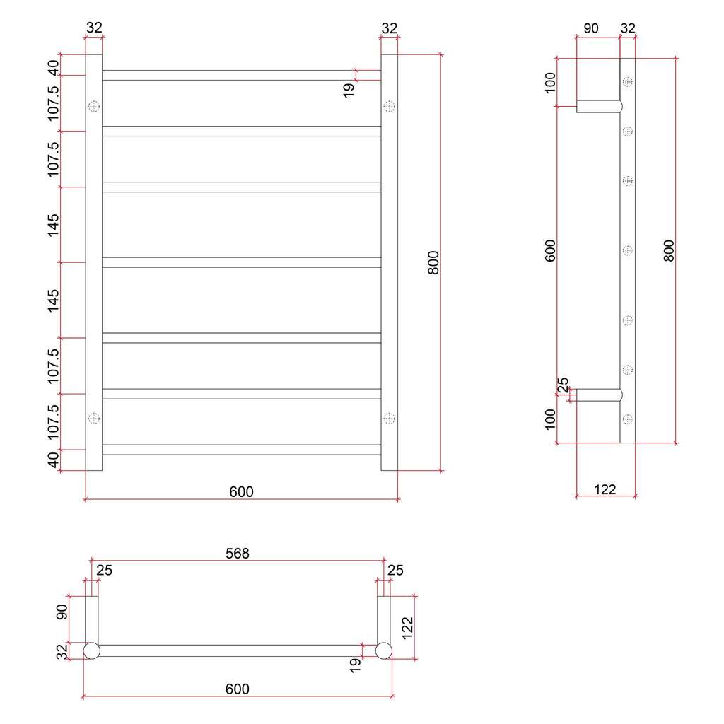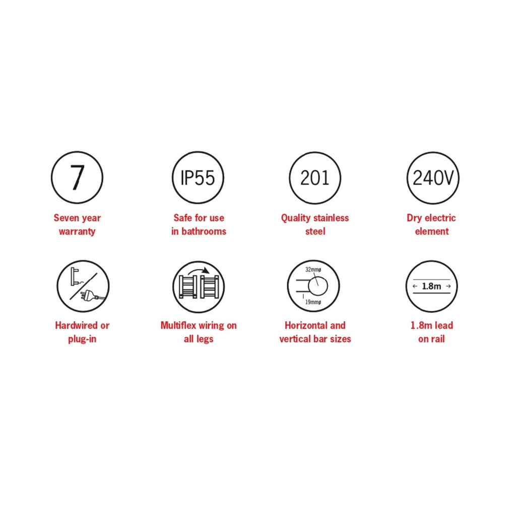 The BS44MW Heated Towel Rail is a 600x800 7-bar satin white powder-coated ladder rail, ideal for matching with white tapware or complementing colored fixtures. It includes multiflex wiring, offering flexible installation with connection points on either side, top or bottom, and options for hardwired or plug-in setups. This efficient electric rail heats to 45-55 degrees quickly and is economical, costing about $1 per week to run. A Timer is recommended for optimal energy management.