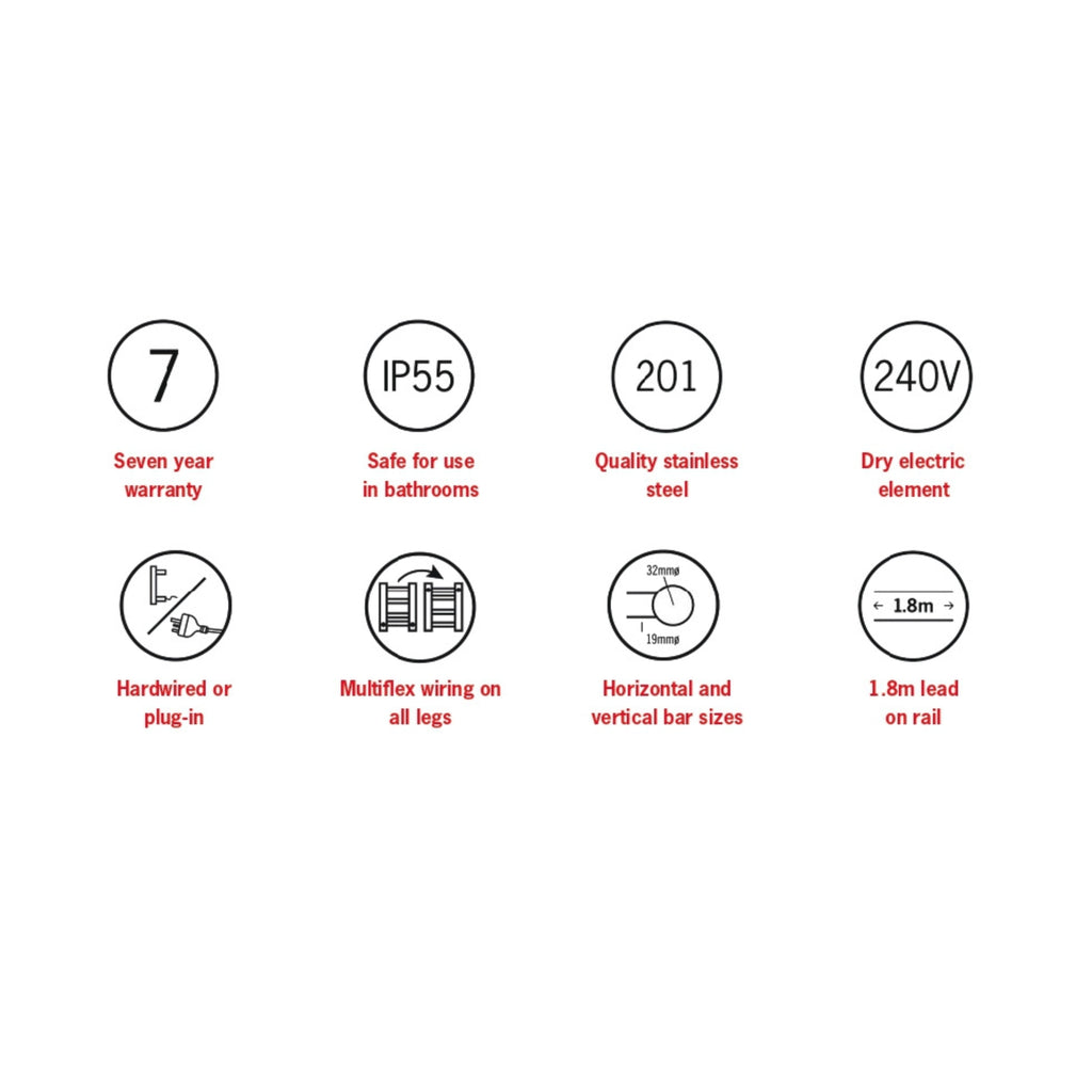 Elevate your bathroom experience with Heated Towel Rails—an affordable luxury enhancing warmth and towel drying. The, a 600x1080 9-bar polished stainless steel ladder rail, seamlessly marries form and function. Its slender design makes it perfect for narrow spaces, while the ample height accommodates three towels. With multiflex wiring, the towel heater swiftly reaches 45-55 degrees, ensuring your towels are luxuriously warm. Operate effortlessly with the on/off switch or optimize efficiency with a Timer for hassle-free control. Redefine comfort in your bathroom with the Heated Towel Rail—an essential blend of style and practicality.