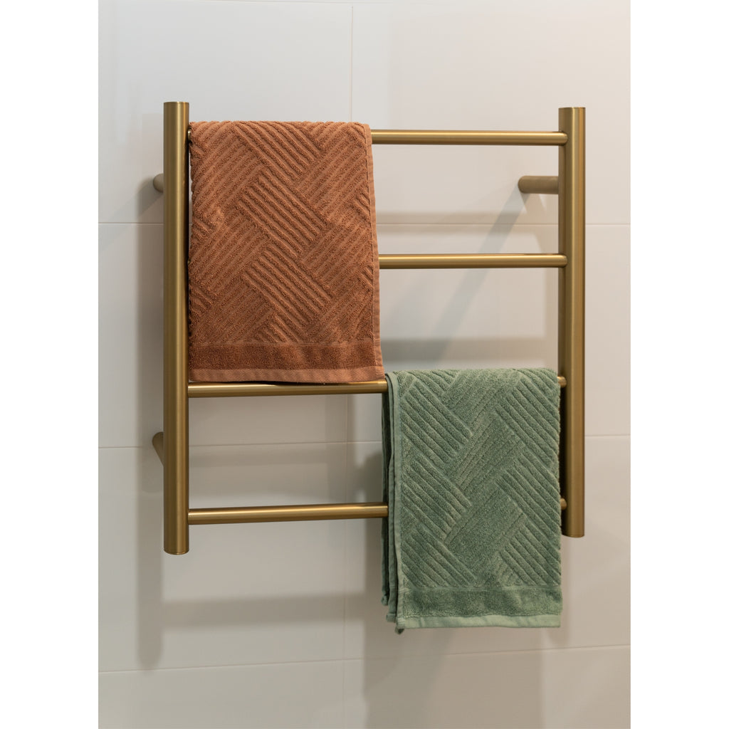 Heated Towel Rails offer affordable luxury in bathrooms, exemplified by the SR25MB. This 550x550 4-bar brushed gold ladder rail, equipped with Multiflex wiring, perfectly fits smaller spaces, drying a single towel efficiently. Its sleek gold finish harmonizes seamlessly with gold tapware. The rail's versatile wiring setup, allowing connection on either side for hardwired or plugin installation, adds convenience out of the box. Operating between 45-55 degrees, this electric towel rail ensures rapid heating, ideal for energy-efficient use, costing as little as $1 a week to run, especially when managed by a Timer for optimized convenience and cost control.