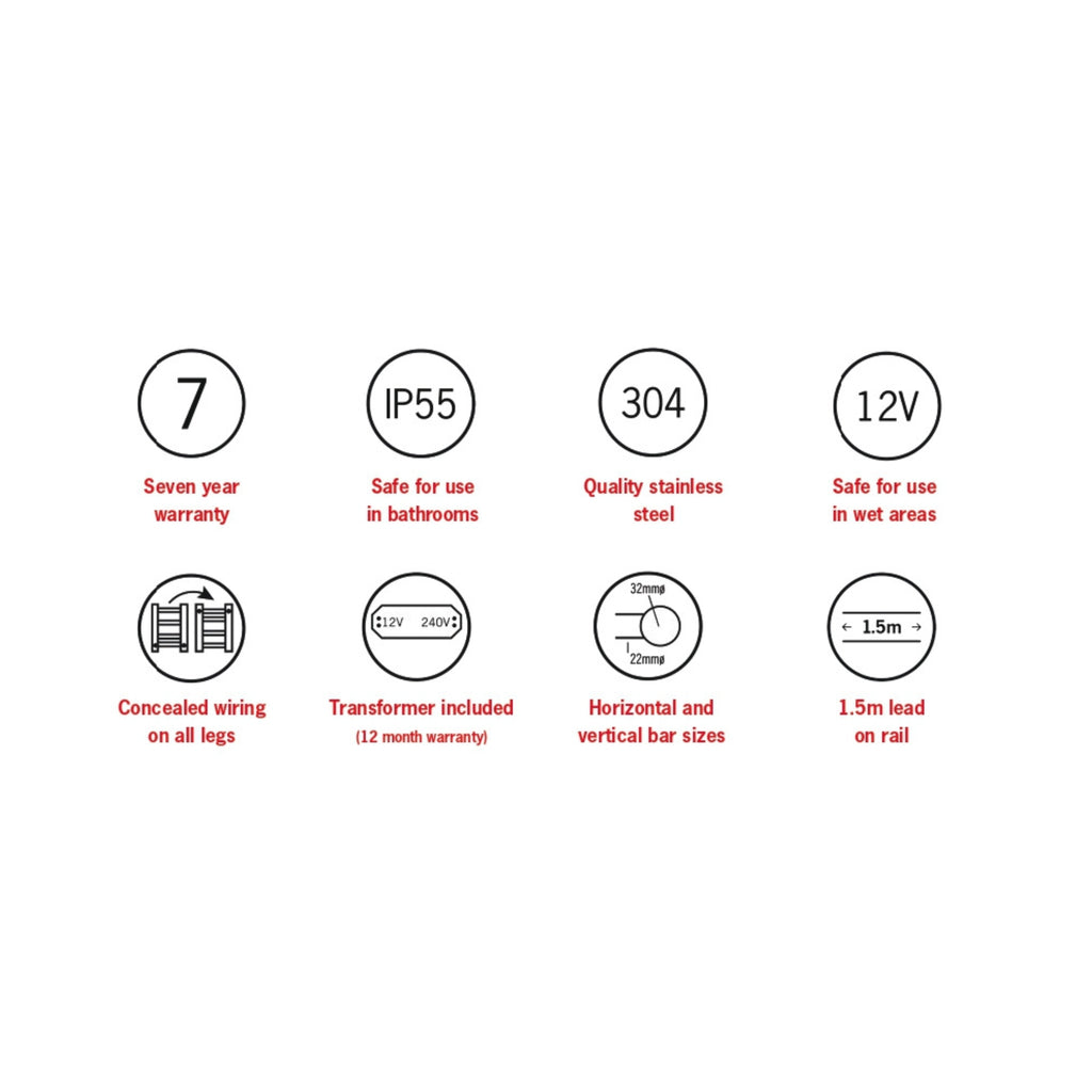 Heated Towel Rails are an affordable luxury for every bathroom, ideal for warming and drying towels. The SRB4412 model is a 600x800 7-bar brushed stainless steel ladder rail, similar to a brushed nickel finish, perfect to complement your tapware. It's a 12V unit, allowing installation near wet areas with the supplied transformer reducing voltage from 240V to 12V. despite the lower voltage, it operates at the same temperature and wattage as a 240V rail. Wiring points are available on both sides, and they can be wired at the top or bottom, but it's only suitable for hardwiring. It rapidly heats up to 45-55 degrees, controllable with an on/off switch or a recommended Timer for cost-efficient operation, costing as little as $1 a week to run.