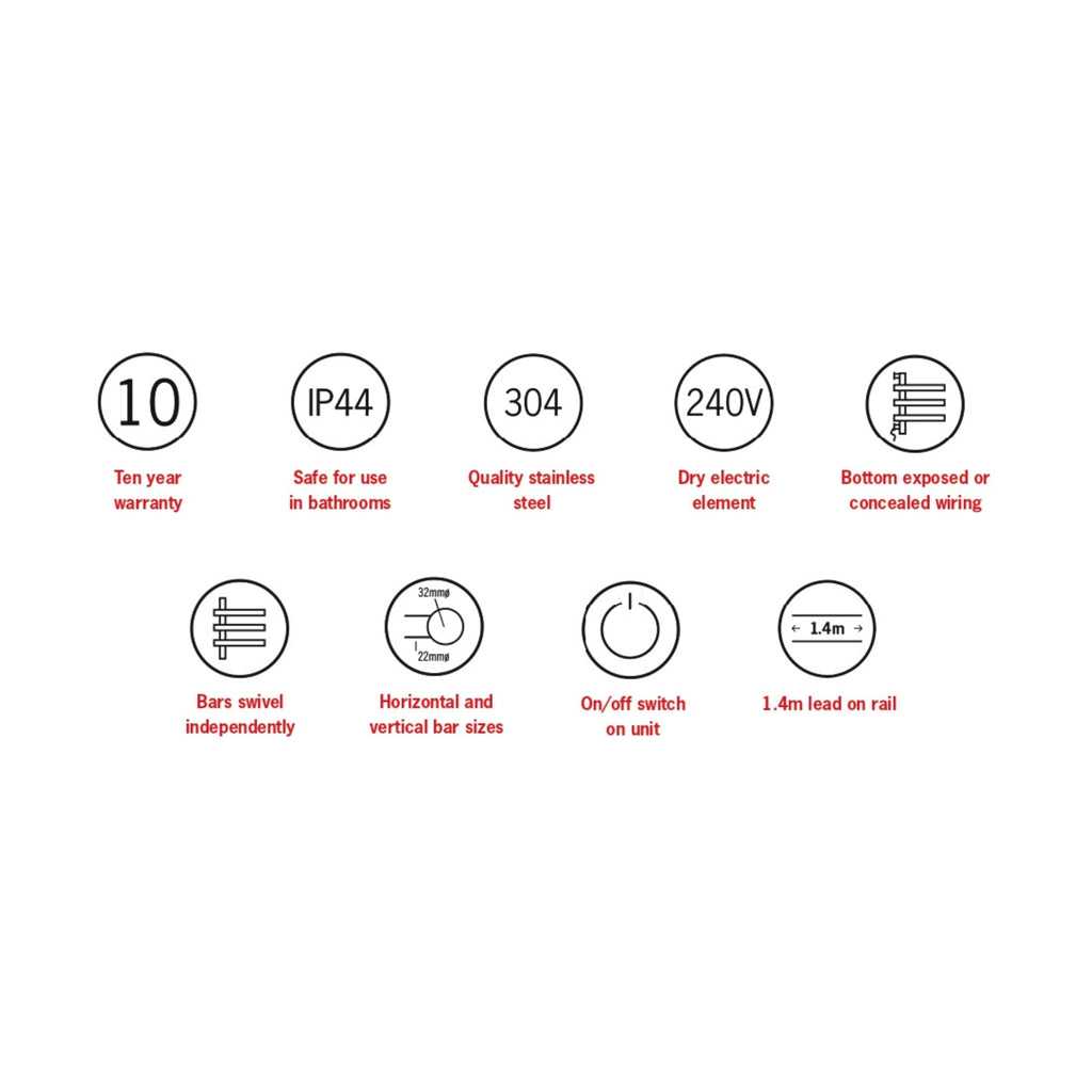 The SV43 Heated Towel Rail, a 675x740 6-bar polished stainless steel swivel rail, defines affordable luxury for every bathroom, ensuring warm and dry towels. Its swivel functionality, allowing 180-degree movement upon wall installation, along with independent bar pivoting, optimizes drying efficiency and accommodates corner placements with minimal wall mounting points. Whether hardwired or plugin, this rail, featuring an on/off switch at the bottom, heats rapidly to 45-55 degrees. Control costs effortlessly with a Timer, maximizing energy efficiency to run as low as $1 weekly.
