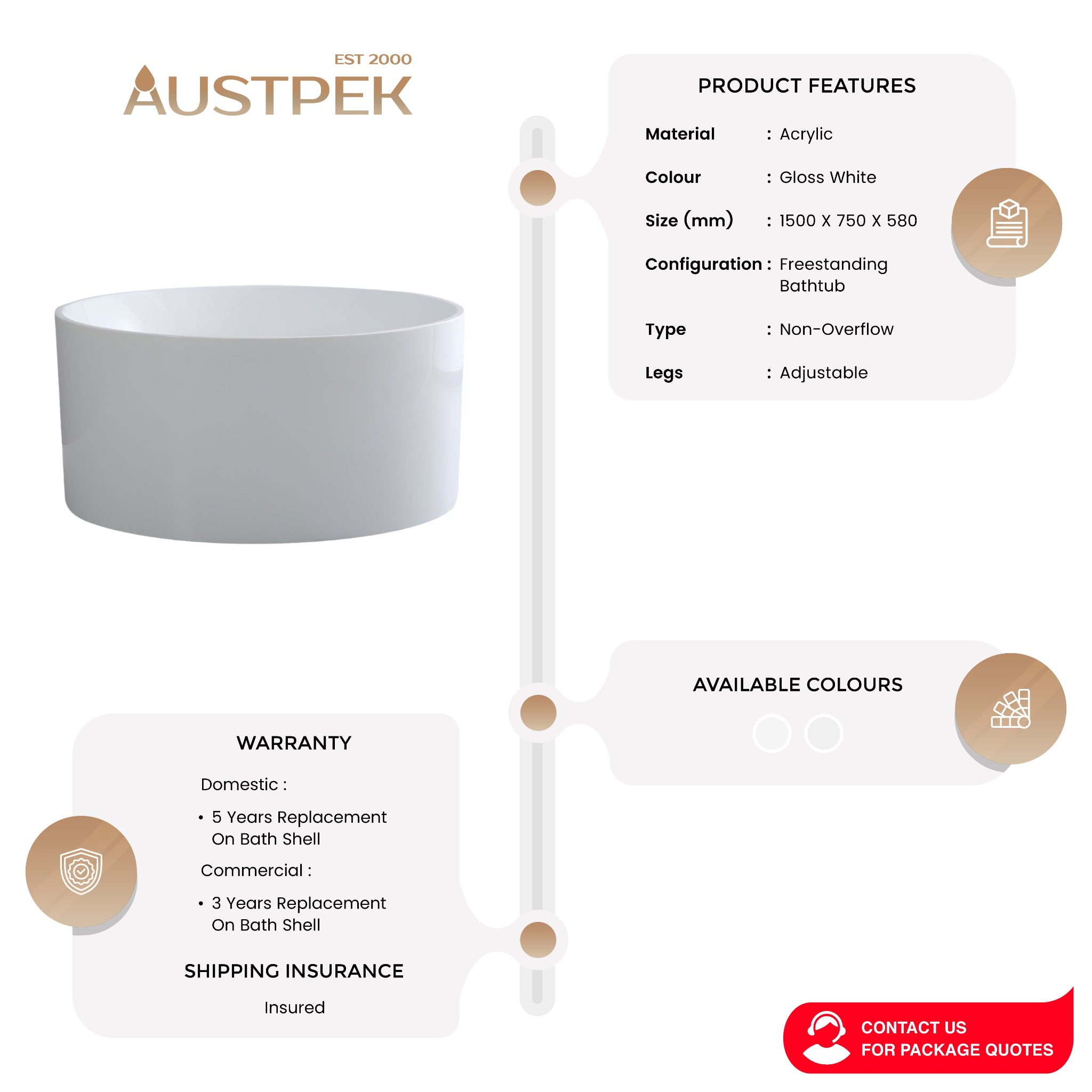 Transform your bathroom into a luxurious haven with the Ceto Como Round Freestanding Bathtub in a pristine Gloss White, elegantly sized at 1280mm. This contemporary design seamlessly blends sophistication and functionality, creating a serene bathing experience. Personalize your oasis with the Matte White option. Enjoy peace of mind with a comprehensive 5-year warranty, offering replacement on the bath shell. Redefine relaxation in your bathing sanctuary with the Ceto Como Round a perfect blend of style and endurance, providing a timeless escape.