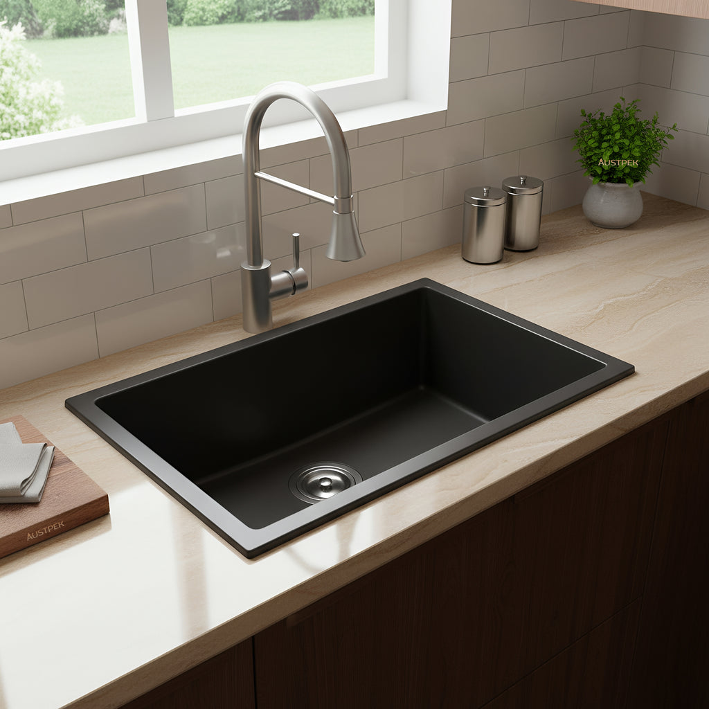 Revitalize your bathroom aesthetic with the Poseidon Quartz Undermount Kitchen Sink in Matte Black (660mm). choose from a variety of sizes and colors to tailor this stunning collection to your unique style. Rest easy with a 5-year warranty, offering both peace of mind and a replacement sink option. Elevate your space with Poseidon where timeless design meets durability, ensuring a statement piece that effortlessly complements your bathroom while standing the test of time. Redefine elegance with this sophisticated addition to your home.