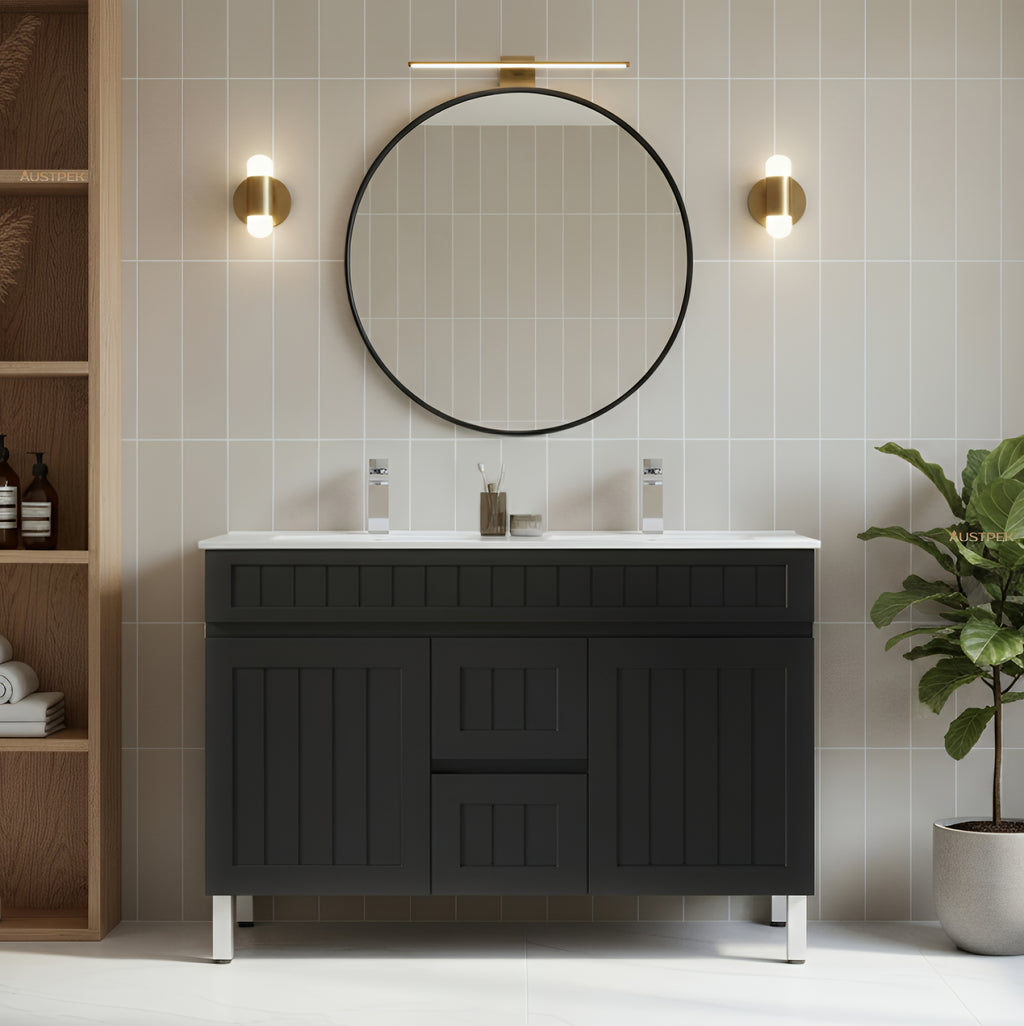 Introducing the Ceto Acacia Shaker Matte Black 1200mm Double Bowl Floor Standing Vanity, a statement piece for modern bathrooms. Available in Matte White, it seamlessly blends style and functionality. Backed by a sturdy 10-year warranty covering replacement parts or complete product for the PVC cabinet and a 1-year labor warranty, this vanity ensures enduring quality. Elevate your space with this elegant and practical addition, offering ample storage and contemporary allure for a refreshed bathroom ambiance.