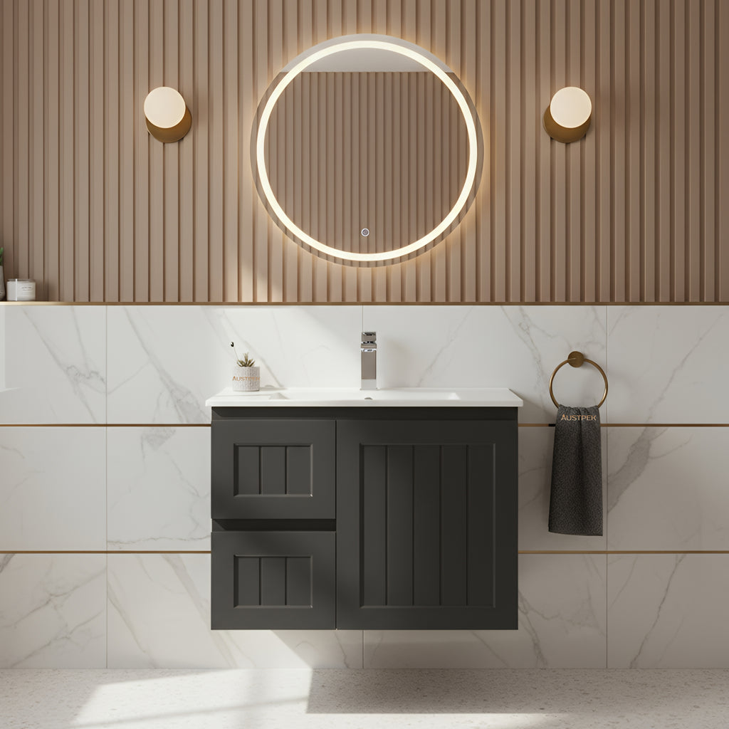Introducing the Ceto Acacia Shaker Matte Black 750mm Wall Hung Vanity, tailored with left and right-hand drawer options, a sophisticated addition to modern bathrooms. Available in pristine Matte White, it seamlessly complements diverse décor. Supported by a reliable 10-year warranty covering replacement parts or complete product for the PVC cabinet, coupled with a 1-year labor warranty, this vanity assures enduring quality. Elevate your space with this versatile and elegant piece, harmonizing functionality with contemporary allure effortlessly.