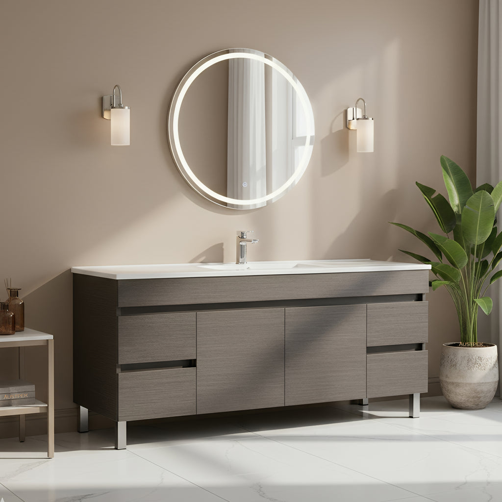 Introducing the Poseidon Evie Colour Vanity Floor Standing Cabinet in a sophisticated Dark Brown. Sized at 1500mm, it's also tailored in various dimensions up to 1200mm for your convenience. This Dark Brown beauty stands out with optional Stone Top enhancements. Need a sneak peek? Request our vanity and stone top samples. Plus, experience the ease with our optional Pop-Up Waste. Benefit from a 10-year PVC warranty upon complete product on PVC cabinet. Simply stunning for every bathroom.