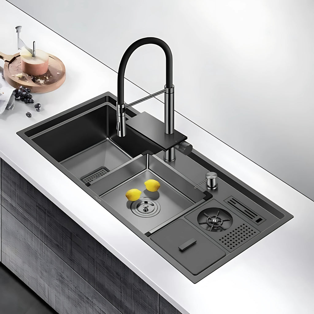 The Alia Smart Undermount Sink Multifunction Gunmetal Grey 1050mm is crafted from premium 3mm stainless steel with a durable PVD coating for superior scratch, stain, and corrosion resistance. Designed for modern kitchens, it features spacious dual sinks, overflow protection, built-in soap dispenser, high-pressure cup washer, compact waste bin, knife rack with drain, and a 360° pull-out mixer tap with waterfall function. The progressive mixer cartridge ensures precise control, backed by a 2-year product replacement warranty.