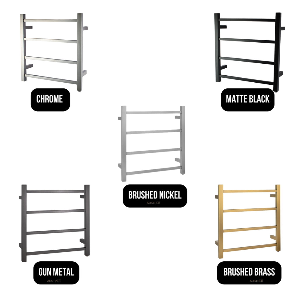 Upgrade your bathroom with the Aquaperla 4-Bar Heated Towel Rail in Chrome, offering a modern and stylish solution for warm, dry towels. Crafted from stainless steel, this 520mm x 500mm x 120mm wall-mounted rail features a sleek square design. With IP55 waterproofing, 40W power, and both exposed and concealed wiring options, it heats to 53-58°C in just 18-22 minutes. SAA certified for safety. Available in Brushed Brass, Black, and Gun Metal. Backed by a 2-year warranty on structure, finishes, and parts.
