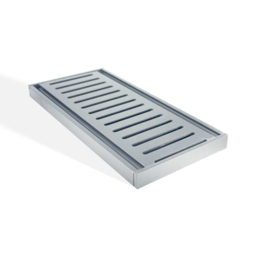 Upgrade your drainage system with the Aquaperla Ezy Flow Floor Grate in Gun Metal, also available in Brushed Black, Gold, Nickel, and Silver. Made from triple anodised aluminium, this 300x100x14mm grate is UV stable for indoor and outdoor use, resisting discoloration. It offers customizable lengths up to 5600mm, with waste size options of 50mm or 80mm. Precision-cut for a perfect fit, it comes with a lifetime rust-proof warranty. Ideal for modern and durable applications.