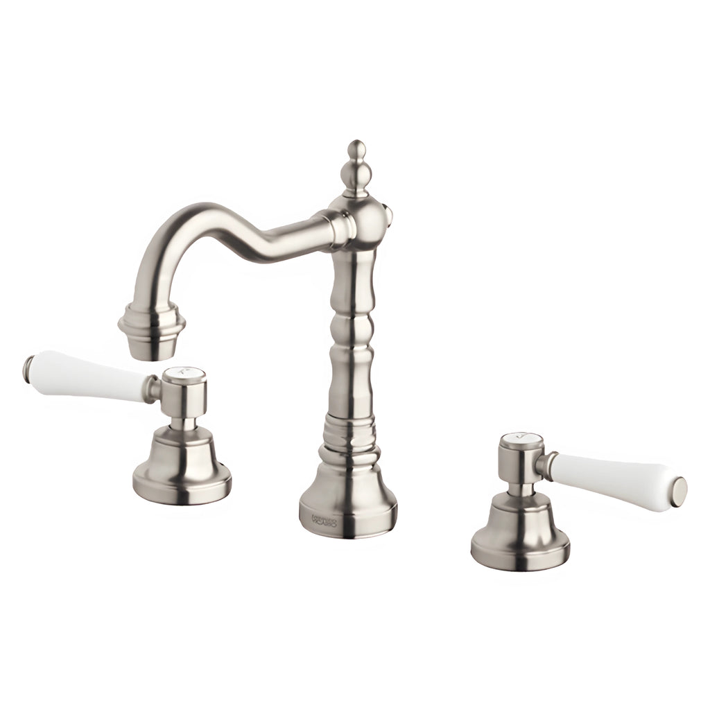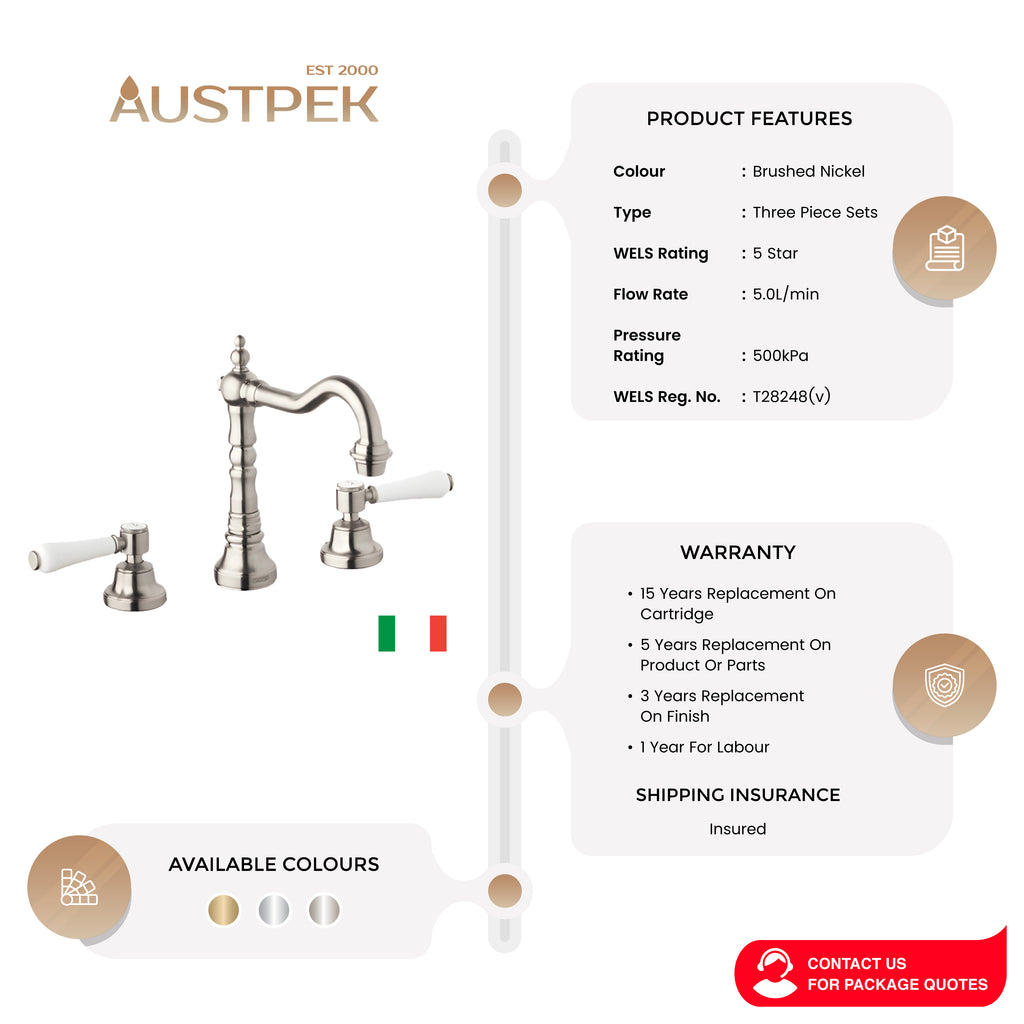 The Armando Vicario Provincial Three Piece Basin Set with Lever Handles Brushed Nickel is Italian designed and manufactured, offering a timeless style to complete your bathroom design. Available in multiple finishes: Chrome, and Brushed Nickel. The set comes with a comprehensive warranty: 15 years replacement on cartridge, 5 years replacement on product or parts, 3 years replacement on finishes, and 1 year on labour.