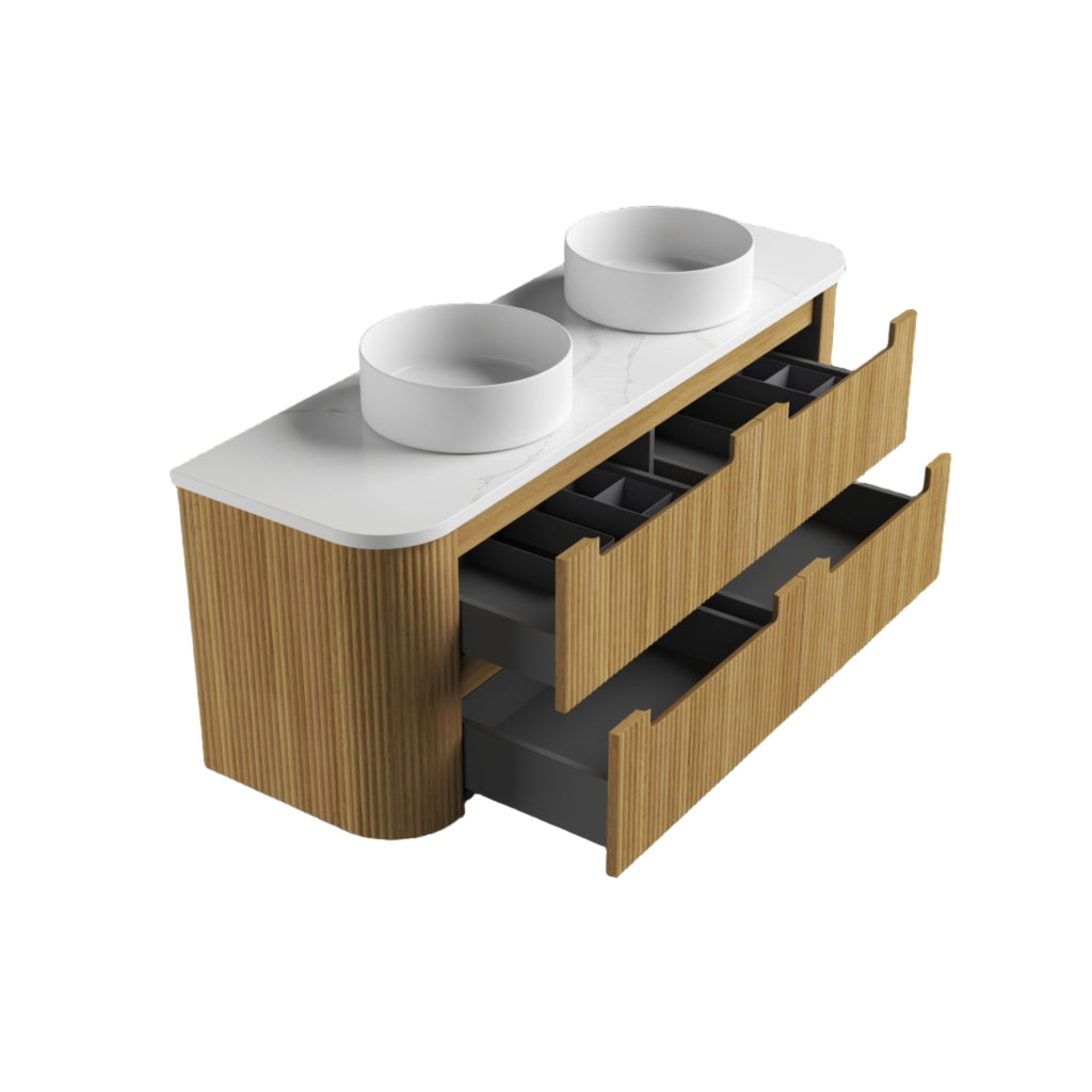 AULIC VARCELLI TIER CURVED HARVEST OAK 1800MM DOUBLE BOWL WALL HUNG VANITY W/ QUADRO HETTICH RUNNERS