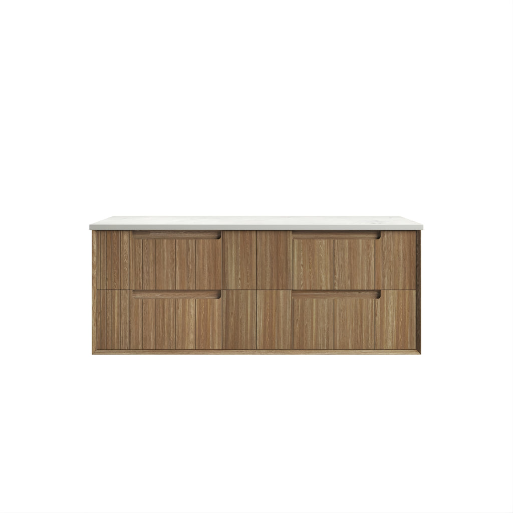 Transform your bathroom with the Aulic Voulari Harvest Oak 1500mm Double Bowl Framed Wall Hung Vanity. Made from premium grade, durable timber plywood, this vanity features a contemporary minimal groove design with natural timber grains and a hard-wearing Harvest Oak laminate finish. Enjoy four soft closing drawers, Hettich Quadro S runners, bevel edge design, drawer organiser, and a premium graphite interior. Cabinets come fully assembled. Also available in 600mm, 750mm, 900mm, 1200mm, and 1800mm sizes.
