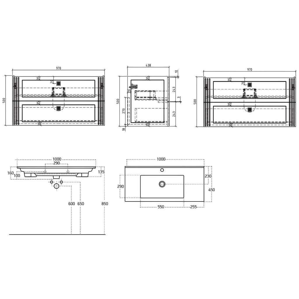 • Easyfix installation system; one tap hole ceramic top with overflow (Made in Turkey), black cabinets feature matching black interiors.