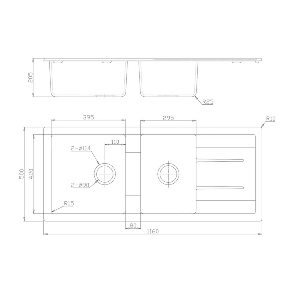 - Overall Sink Size: 1160mm X 500mm X 205mm
