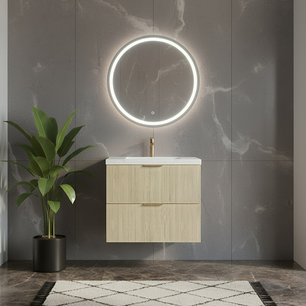 The Ceto Eden Classic Oak 750mm Single Bowl Wall Hung Vanity brings timeless elegance and practicality to any bathroom. Crafted from durable PVC in a fluted Classic Oak finish, this 740mm x 455mm x 520mm vanity features a sleek wall-hung design with soft-closing drawers and a modern bar handle. The single bowl offers functional simplicity, while an optional pop-up waste adds convenience. Also available in Prime Oak, this fully assembled vanity comes with extensive domestic and commercial warranties.