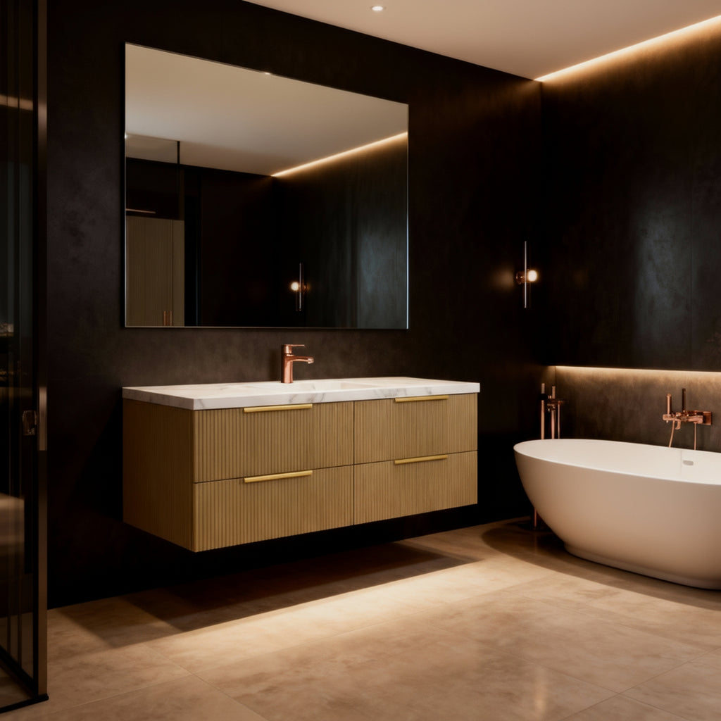 The Ceto Eden Prime Oak 1500mm Single Bowl Wall Hung Vanity embodies modern bathroom luxury with its fluted Prime Oak finish and minimalist wall-hung design. Measuring 1490mm x 455mm x 520mm, this PVC-constructed vanity offers a sleek, space-saving solution with soft-closing drawers and elegant bar handles. Available in both Single and Double Bowl options, and also in Classic Oak, it ensures functionality and style. Includes a 10-year domestic warranty. Waste sold separately.