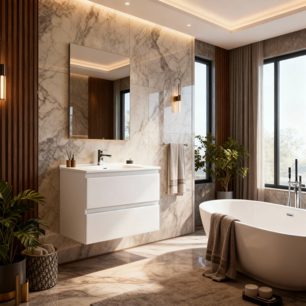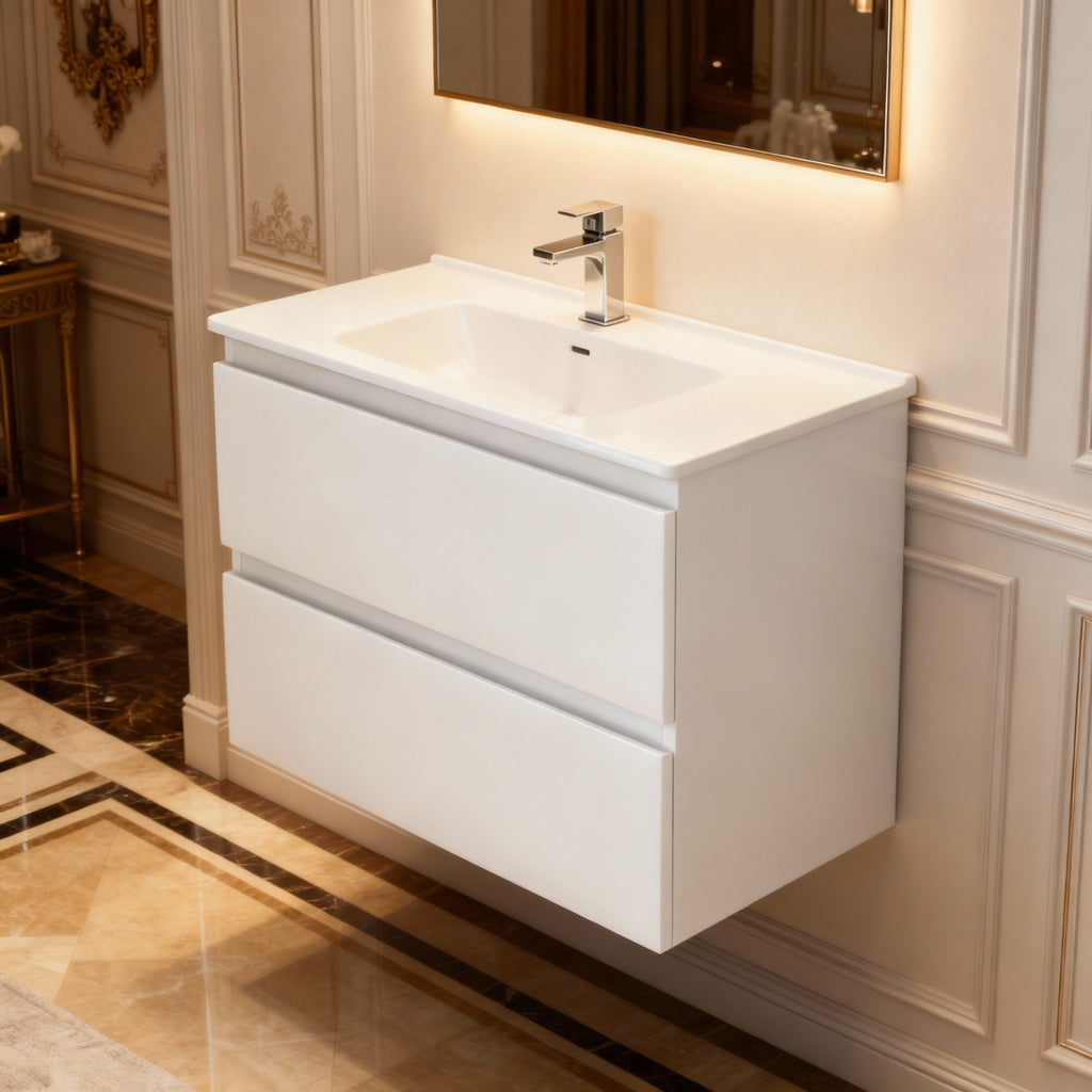 The Ceto Revive Matte White 600mm Wall Hung Vanity offers a sleek, space-saving design perfect for modern bathrooms. Crafted from durable PVC, this single bowl vanity features soft-closing U-shape drawers for smooth operation and a fully assembled cabinet for easy installation. Its matte white finish enhances any décor, providing both elegance and practicality. Also available in 750mm and 900mm sizes. Enjoy peace of mind with a 10-year domestic warranty and a 5-year commercial warranty on the PVC cabinet.
