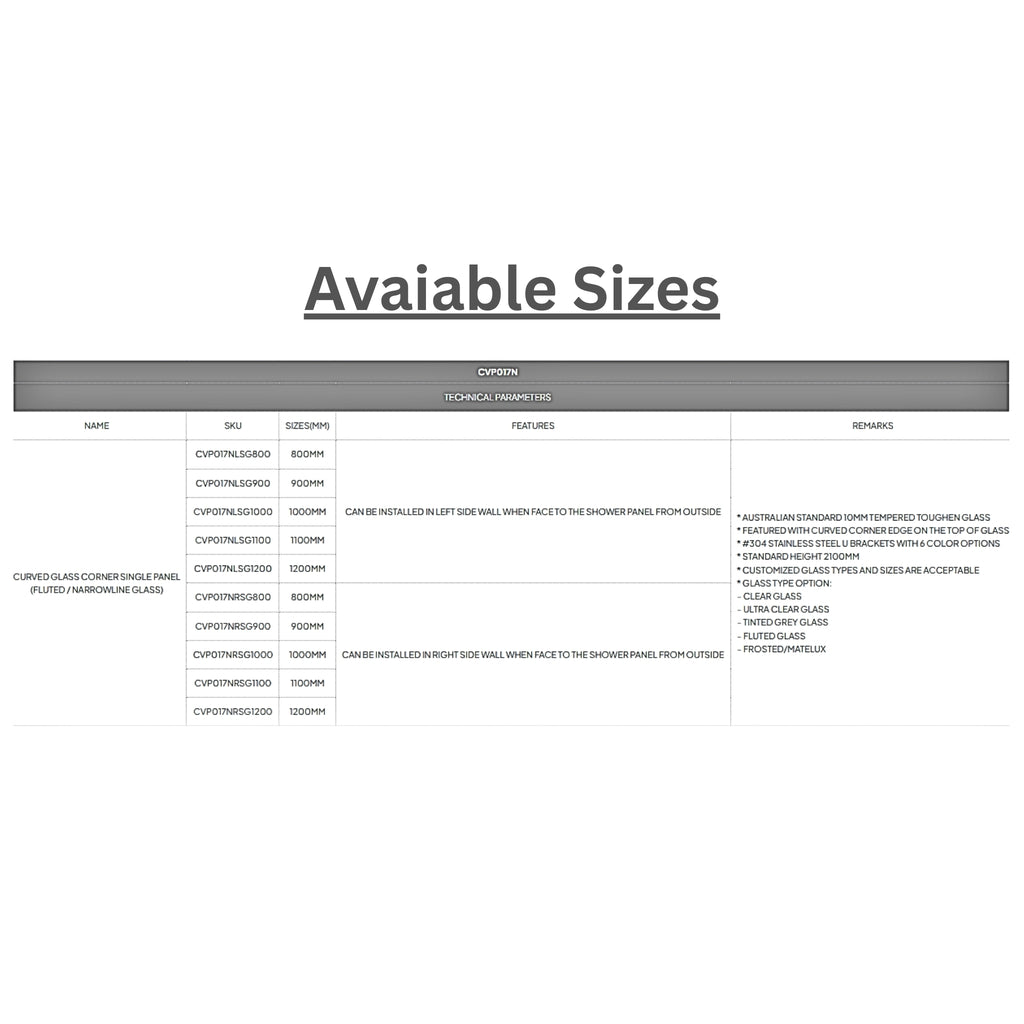 - Type: Frameless Walk in Single Panel Curved Corner Fluted / Narrowline
