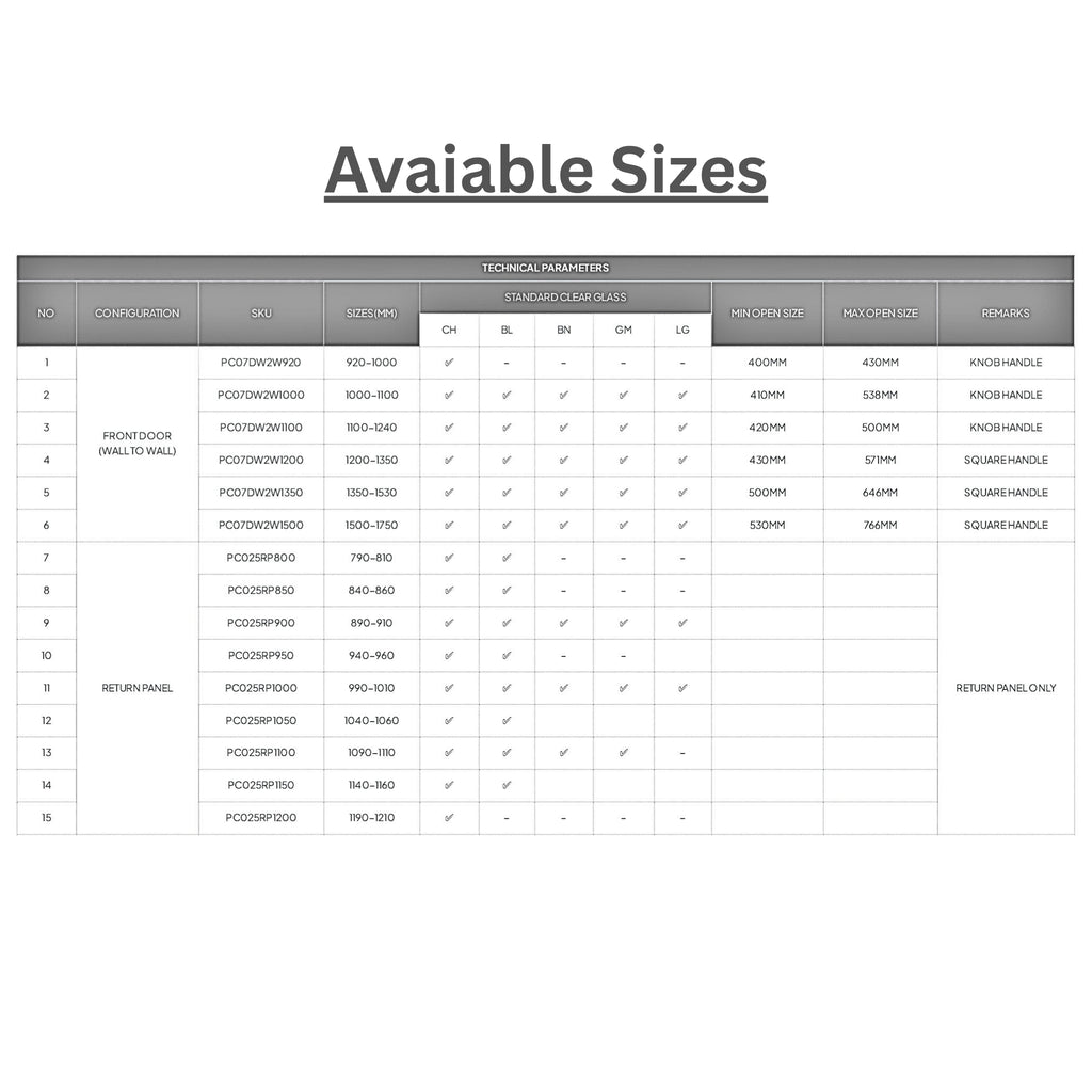 - Return Panel Sizes: 790mm-810mm | 840mm-860mm | 860-885mm | 890mm-910mm | 940mm-960mm | 990mm-1010mm | 1040-1060mm | 1090-1110mm | 1140-1160mm | 1190-1210mm