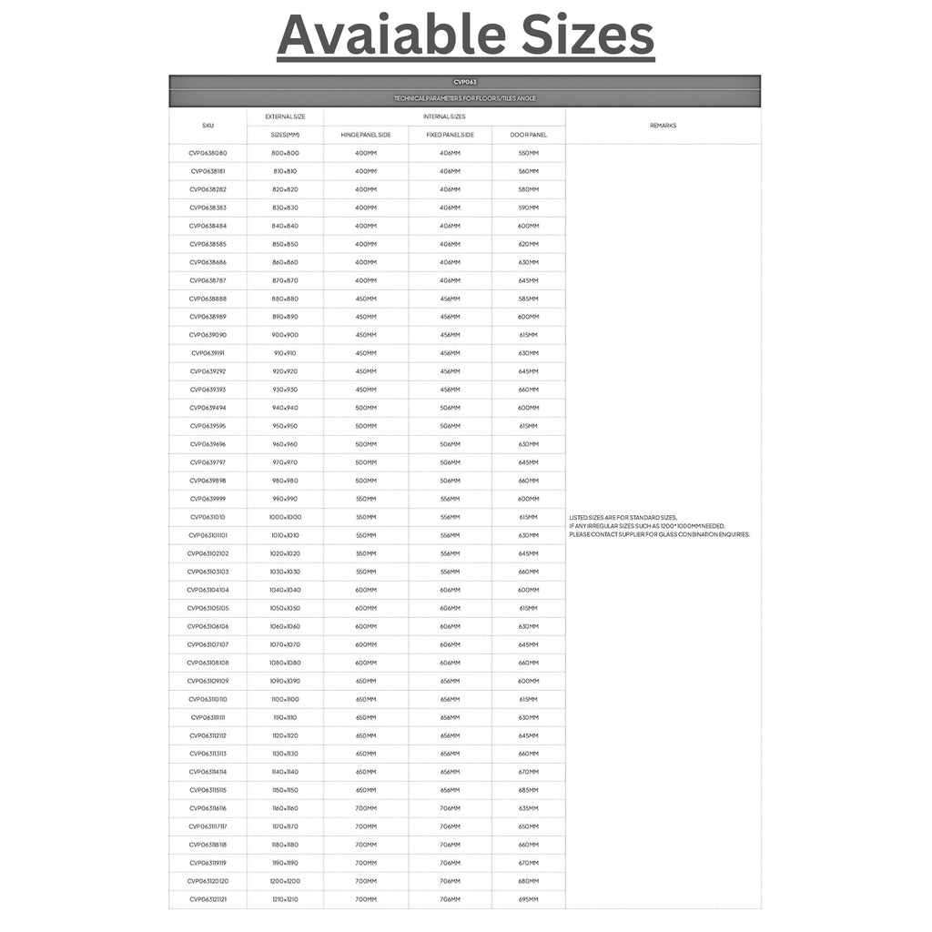 - Wall To Wall Sizes: 800mm X 800mm | 900mm X 900mm | 1000mm X 1000mm | 1100mm X 1100mm | 1150mm X 1150mm