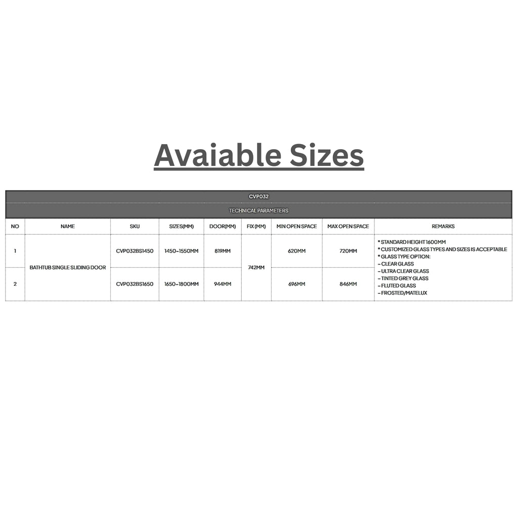 Upgrade your bathroom with Covey Wall to Wall Frameless Single Sliding Door Bath Screen. Choose your style with finishes in Chrome, Matte Black, Brushed Nickel, Gun Metal Grey, Brushed Gold, Light Gold and Brushed Gold. Covey seamlessly blends modern design with functionality, creating a luxurious bathing experience. Covey ensures longevity with a 5-year limited warranty on glass and hardware fittings, and a 1-year warranty on vinyl components for added peace of mind. Elevate your bathroom experience with Covey's exceptional quality and timeless elegance.
