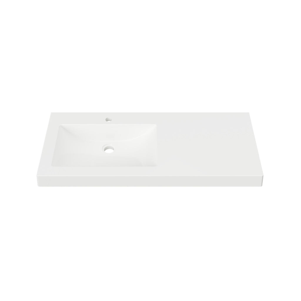 The Duroclass Monaco Grand offset single bowl undermount vanity top is a smart, space-efficient solution for modern bathroom layouts. Made in Australia from premium mineral composite, it features a gloss white finish with a Mitsubishi SHINKOLITE™ PX sanitary-grade surface for superior heat and stain resistance. Available in multiple sizes, the offset rectangular bowl maximises usable bench space while delivering a hygienic, anti-bacterial surface, precision thermoformed fit and durable performance tested to Australian Standard AS1730.