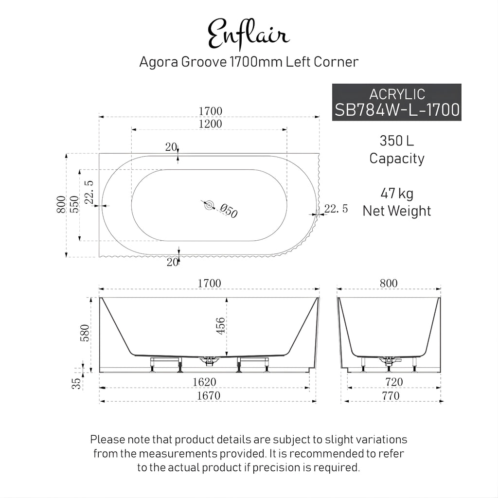 ENFLAIR AGORA GROOVE FLUTED LEFT CORNER BATHTUB MATTE BLACK (AVAILABLE IN 1500MM AND 1700MM)