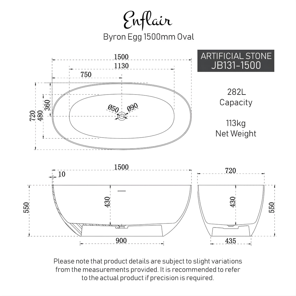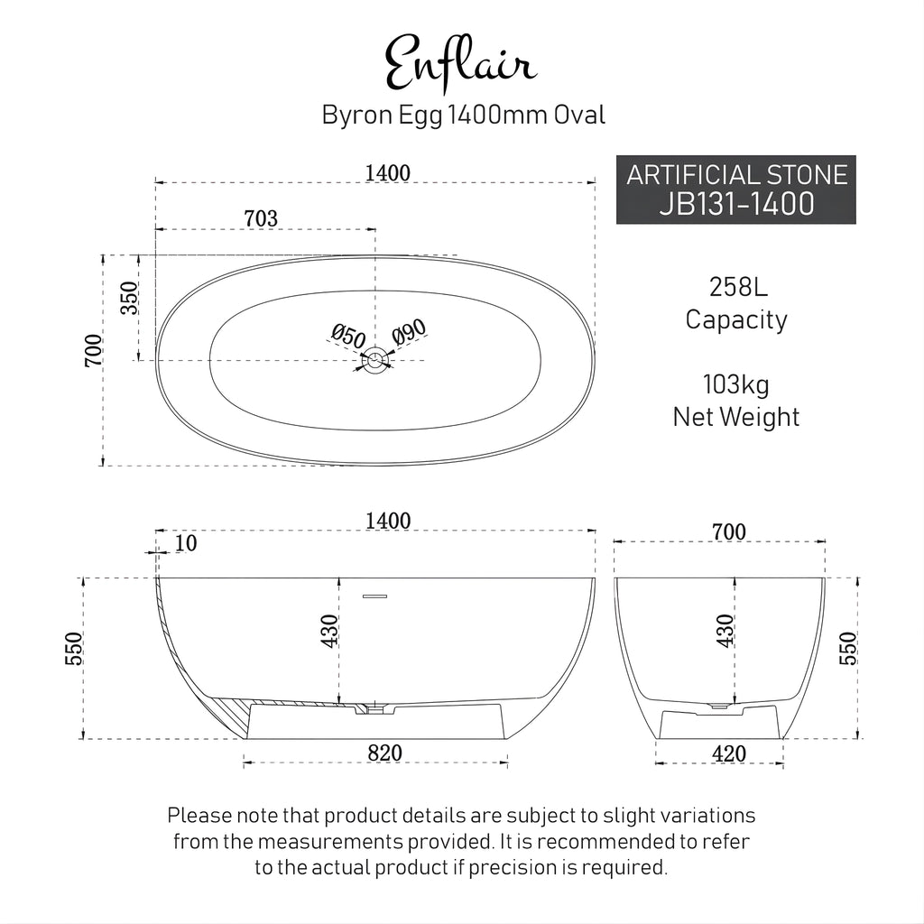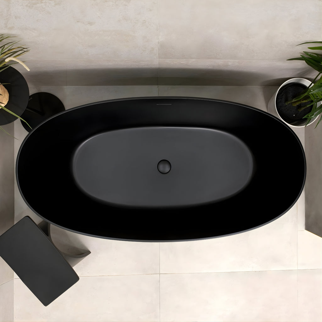 The Enflair Byron Egg Freestanding Bath in Matte Black combines striking aesthetics with superior comfort. This overflow bath features a spacious interior, meticulously designed to round nicely with your shoulders as you lean back. Crafted from premium artificial stone, its matte black finish ensures long-lasting style. With multiple sizes available from 1300mm to 1700mm, it suits layouts without compromising on luxury. This durable bathtub includes a 15-year structural warranty, promising a timeless centrepiece for bathrooms.