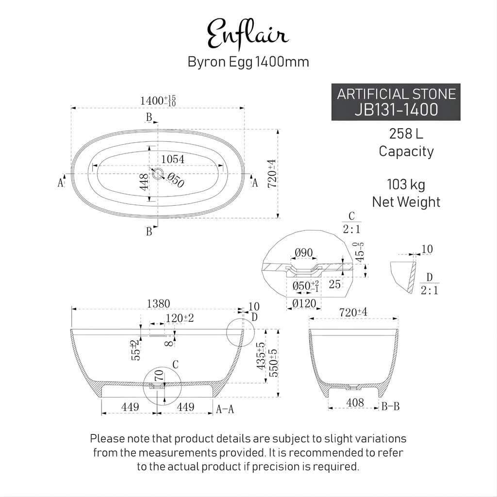 The Enflair Byron Egg Freestanding Bathtub offers unparalleled luxury in a radiant gloss white finish. Crafted from premium artificial stone, this versatile overflow bath comes in multiple sizes from 1300mm to 1800mm. Its spacious interior is designed for comfort, ensuring a serene bathing experience without compromise. This elegant centrepiece adds vibrant colour to your bathroom harbour. Benefit from a fifteen year structural warranty, five years for finish, and one year for parts. Pure modern elegance.