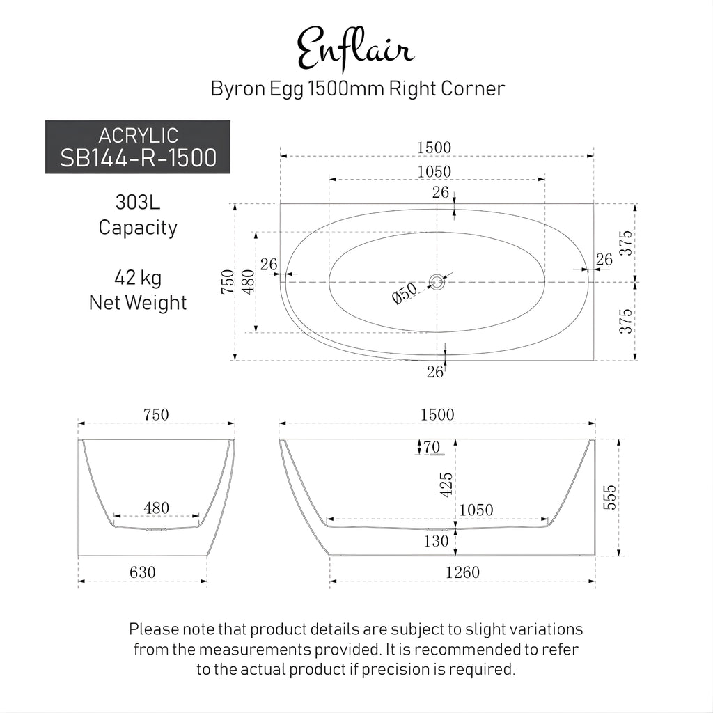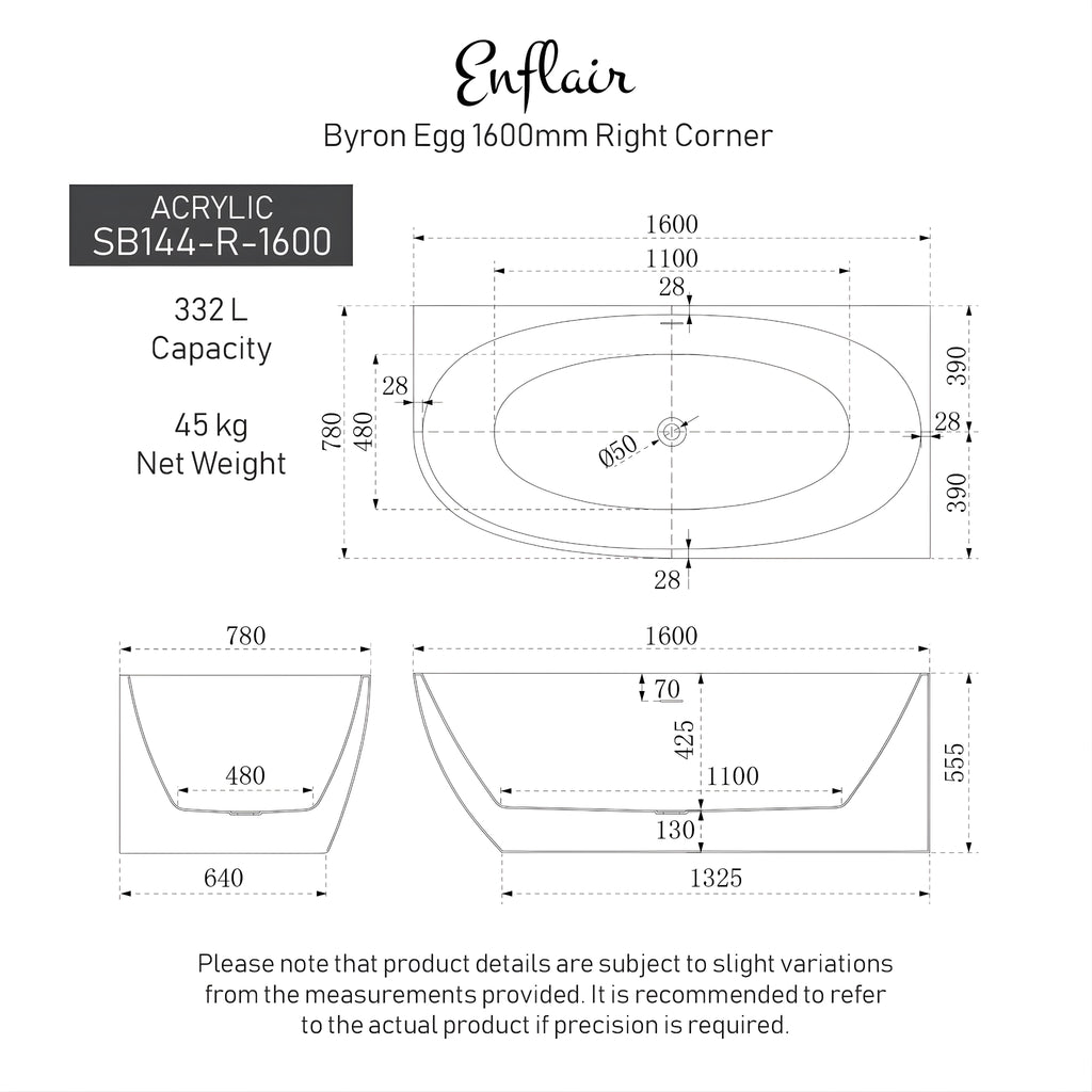 The Enflair Byron Egg Right Corner Freestanding Bath adds bold sophistication to contemporary bathrooms. Finished in striking matte black acrylic, this overflow bathtub provides luxurious comfort across multiple sizes and generous capacities. Designed for corner installation, it features adjustable legs and a centred waste position for accurate fitting. Ideal for statement bathroom designs, it offers durability, easy cleaning, and long-lasting performance. Plug and waste optional, suitable for premium residential and commercial applications Australia-wide modern interiors.