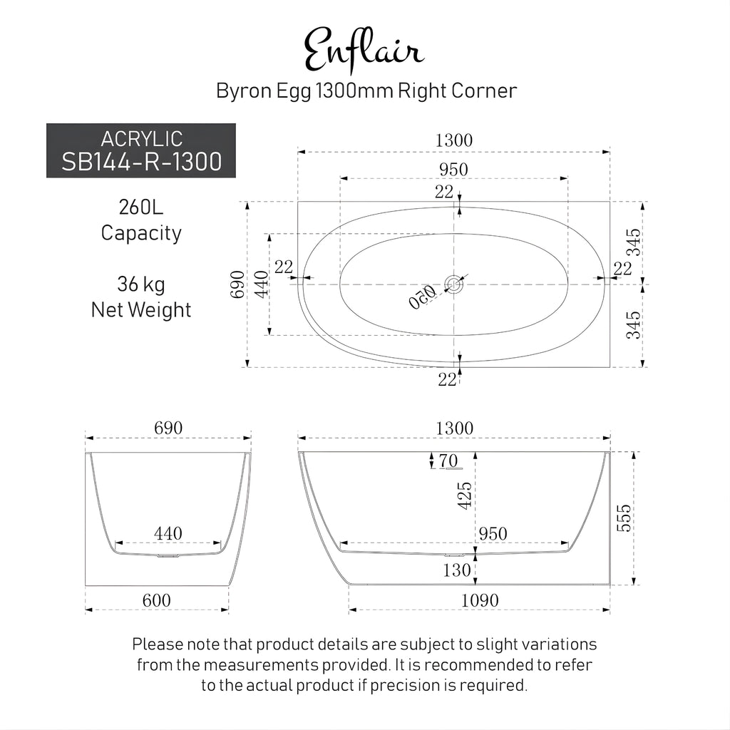 ENFLAIR BYRON EGG RIGHT CORNER FREESTANDING BATH WITH OVERFLOW MATTE WHITE (MULTIPLE SIZES AVAILABLE)