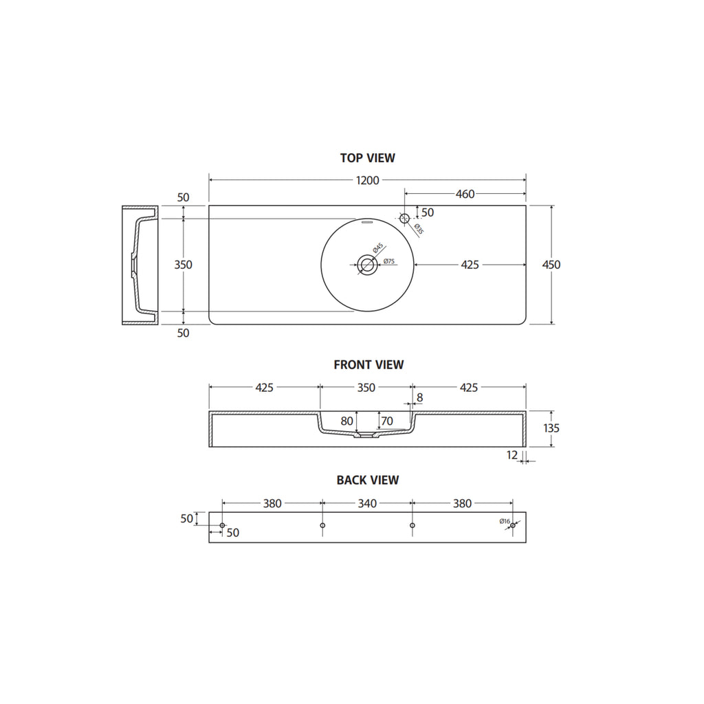 The Fienza Encanto Solid Surface Wall Hung Basin with a Center Bowl (Matte White, 1200mm) adds a touch of modern elegance to any bathroom. Crafted from durable solid surface material, it features a sleek, taphole-free design. Enjoy peace of mind with a 25-year structural warranty, a 5-year finish warranty, and 1-year labour coverage for both domestic and commercial use. This basin perfectly combines style, functionality, and long-lasting quality for your bathroom.