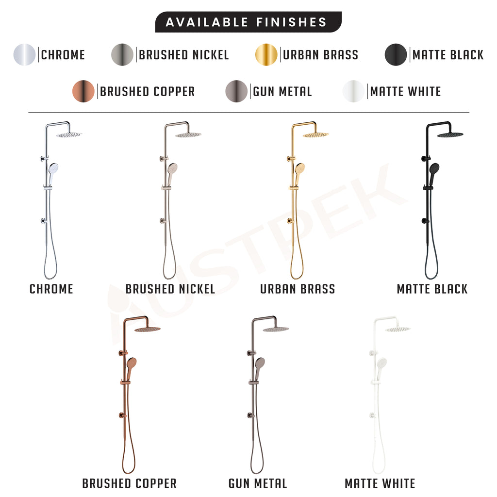 The Fienza Kaya Twin Shower Brushed Copper combines premium design with lasting performance. Its 250mm ultra-thin overhead shower features easy-clean TPR nozzles and a brass swivel joint, complemented by a single-setting hand shower. The solid brass rail includes an integrated top water inlet, diverter, and adjustable slider for height and angle, paired with a 1.5m stainless steel hose. Finished in durable brushed copper, this WELS 3 Star rated system delivers 9 L/min efficiency and is backed by extensive warranties.