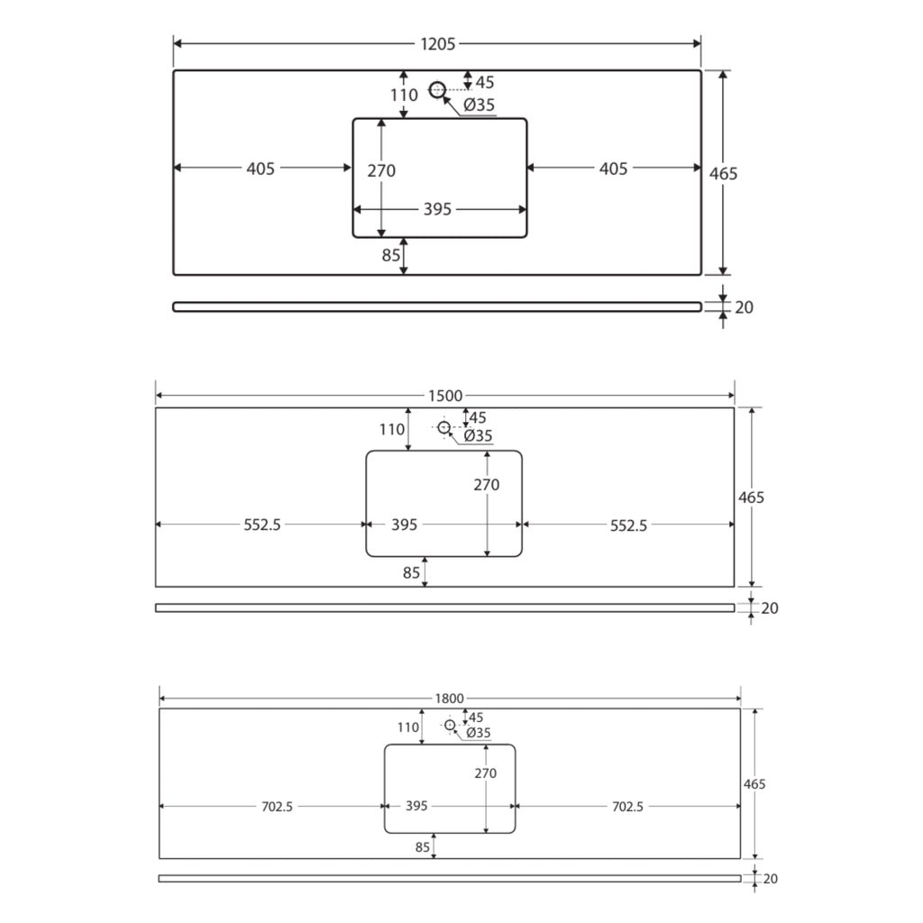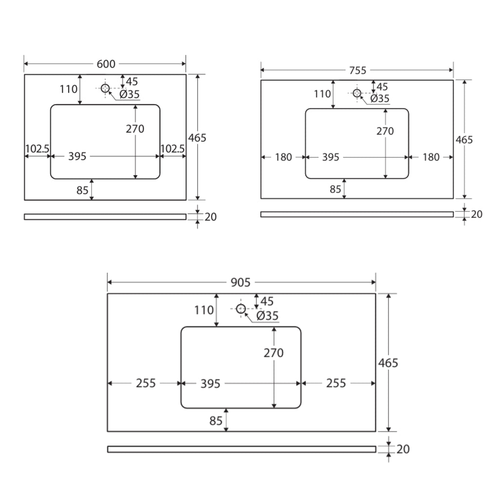 - Size: 600mm x 465mm x 20mm | 750mm x 465mm x 20mm | 900mm x 465mm x 20mm | 1200mm x 465mm x 20mm | 1500mm x 465mm x 20mm