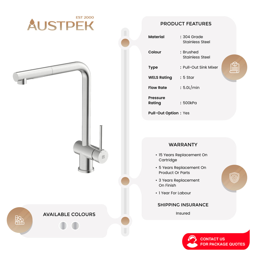The Gareth Ashton 304 Grade Square Neck Pull-Out Sink Mixer with Dual Spray combines form and function, featuring a dual spray pull-out mechanism. Manufactured from quality heat and corrosion-resistant 304 Stainless Steel. The mixer comes with a comprehensive warranty: 15 years replacement on cartridge, 5 years replacement on product or parts, 3 years replacement on finish, and 1 year on labour. Available in Brushed Steel and Polished Steel.