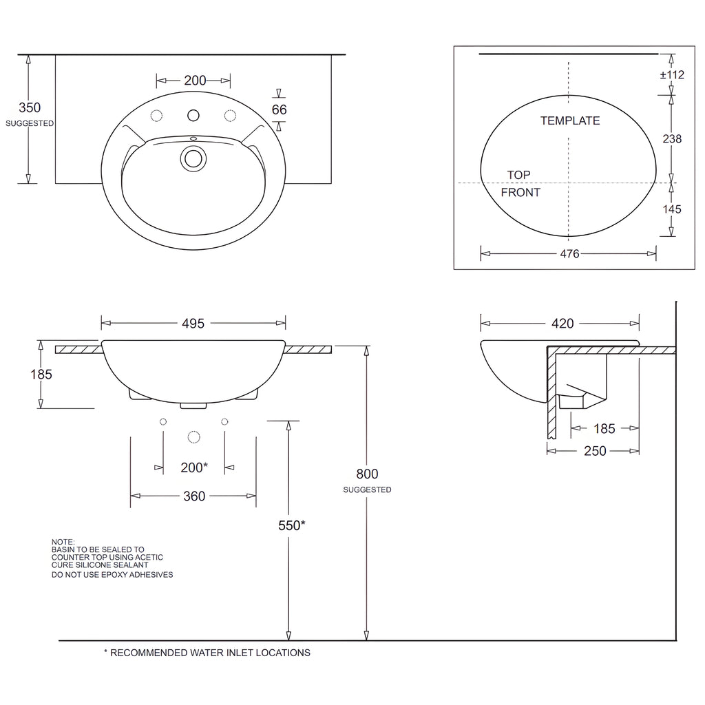 JOHNSON SUISSE AVON SEMI-RECESSED COUNTERTOP BASIN THREE TAPHOLE WHITE 495MM