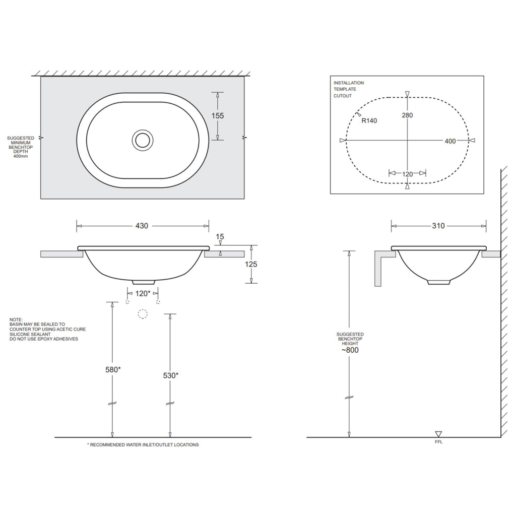 JOHNSON SUISSE EMILIA OVAL COMPACT VANITY TOP-MOUNT BASIN WHITE 430MM