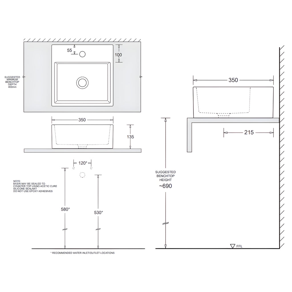 JOHNSON SUISSE QUADO SMALL SQUARE COUNTERTOP BASIN WHITE 350MM