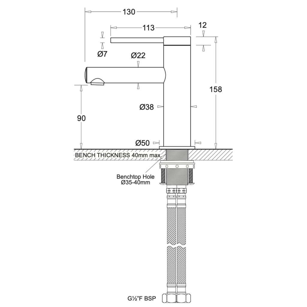The Johnson Suisse Venezia Lead-Free Basin Mixer 158mm in Chrome combines modern minimalism with durable performance. Designed with a thin pin lever, ceramic disc valve, and aerated outlet, it ensures smooth operation and efficient water flow at 4.5 L/min with a 6-Star WELS rating. Its DZR brass construction, simple fixing system, and flexible hot/cold hose connections provide long-lasting reliability. Suitable for 150–500kPa pressure and 1–75°C temperature. Includes 20-year parts replacement warranty.