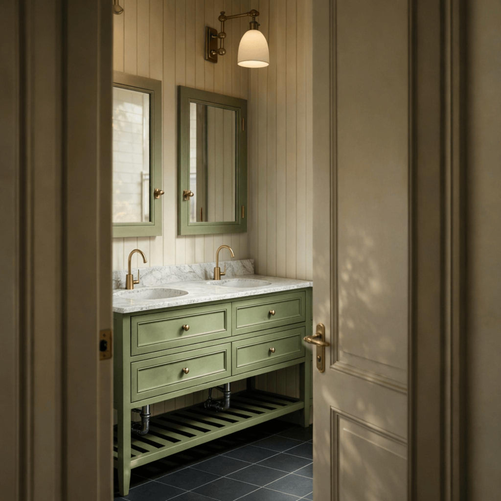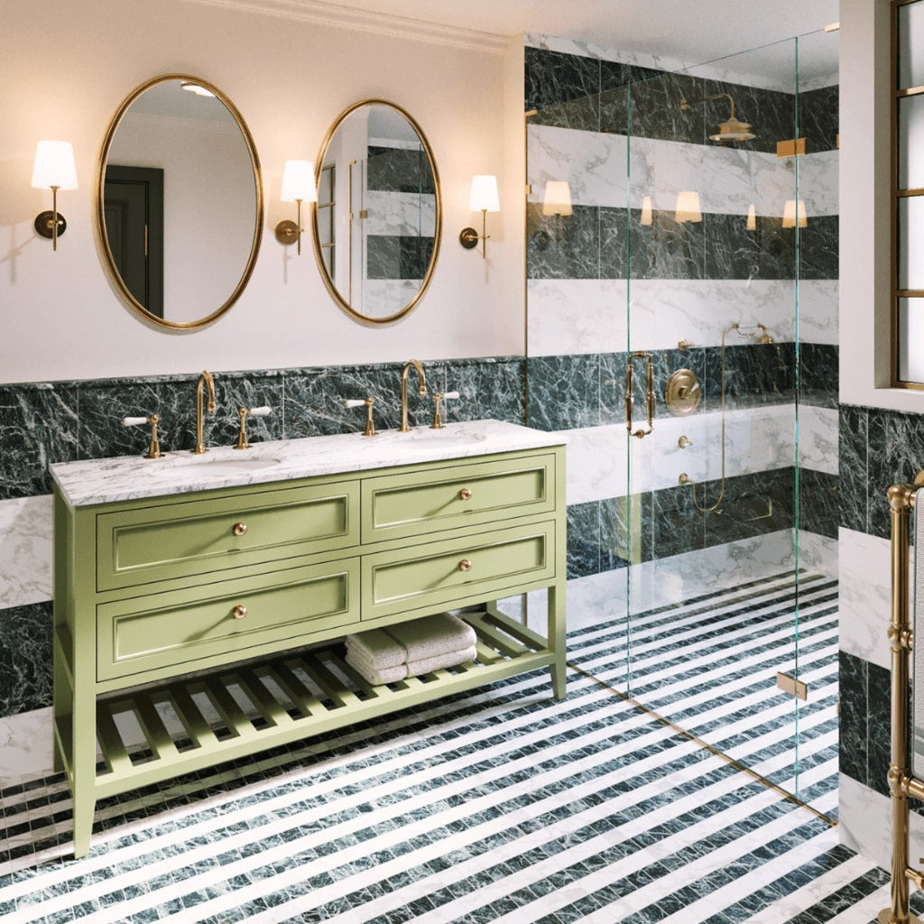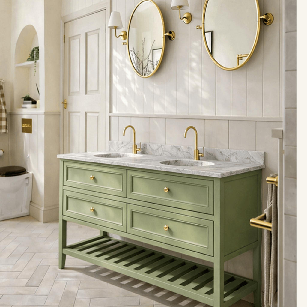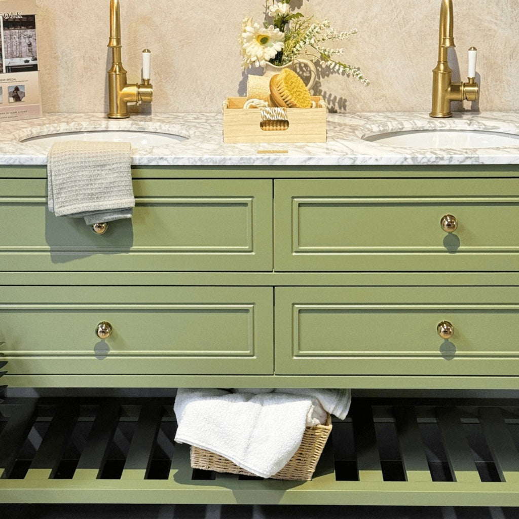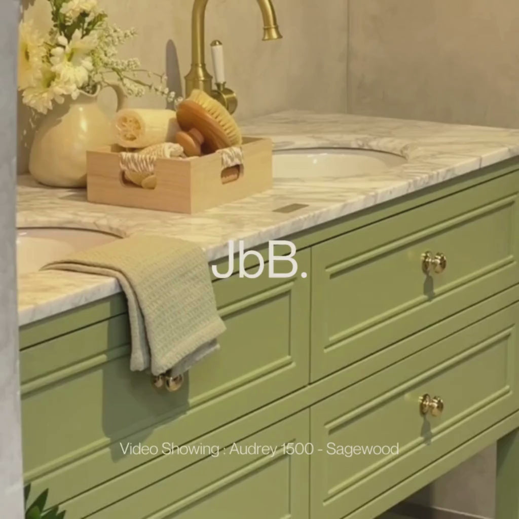 The Joinery By Bears Audrey Sagewood 1500mm Floor Standing Vanity is perfect for larger bathrooms, offering a double bowl design with timeless elegance. Crafted with a durable hardwood structure, MDF drawer fronts, and a luxurious natural Carrara marble top, it’s both stylish and practical. Brass handles add a refined touch. Backed by a 5-year warranty on the cabinet and a 2-year warranty on the benchtop, it ensures quality and peace of mind with repair or replacement coverage.