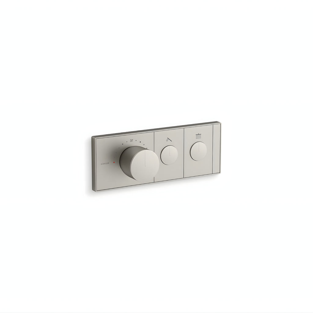 Elevate your shower design with the Kohler Anthem Two-Outlet Recessed Mechanical Thermostatic Control Panel in Brushed Nickel. Crafted from durable zinc, this wall-mounted thermostatic control panel combines precision, safety, and sleek styling. It features an adjustable high-temperature limit stop and easy-to-use on/off shower outlet buttons for effortless control. The low-profile, water-resistant design ensures long-lasting performance and simple cleaning. Measuring 273mm, it supports up to 8gpm flow capacity and requires a two-port thermostatic valve (sold separately). Also available in Matte Black, Brushed Nickel, and Brushed Brass. Includes a 10-year parts warranty.