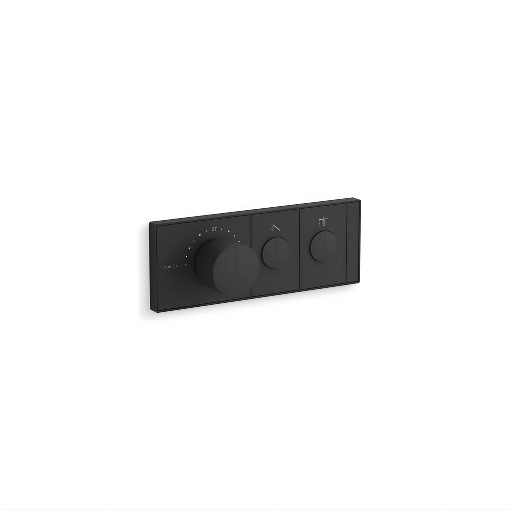 Elevate your shower design with the Kohler Anthem Two-Outlet Recessed Mechanical Thermostatic Control Panel in Matte Black. Crafted from durable zinc, this wall-mounted thermostatic control panel combines precision, safety, and sleek styling. It features an adjustable high-temperature limit stop and easy-to-use on/off shower outlet buttons for effortless control. The low-profile, water-resistant design ensures long-lasting performance and simple cleaning. Measuring 273mm, it supports up to 8gpm flow capacity and requires a two-port thermostatic valve (sold separately). Also available in Matte Black, Brushed Nickel, and Brushed Brass. Includes a 10-year parts warranty.