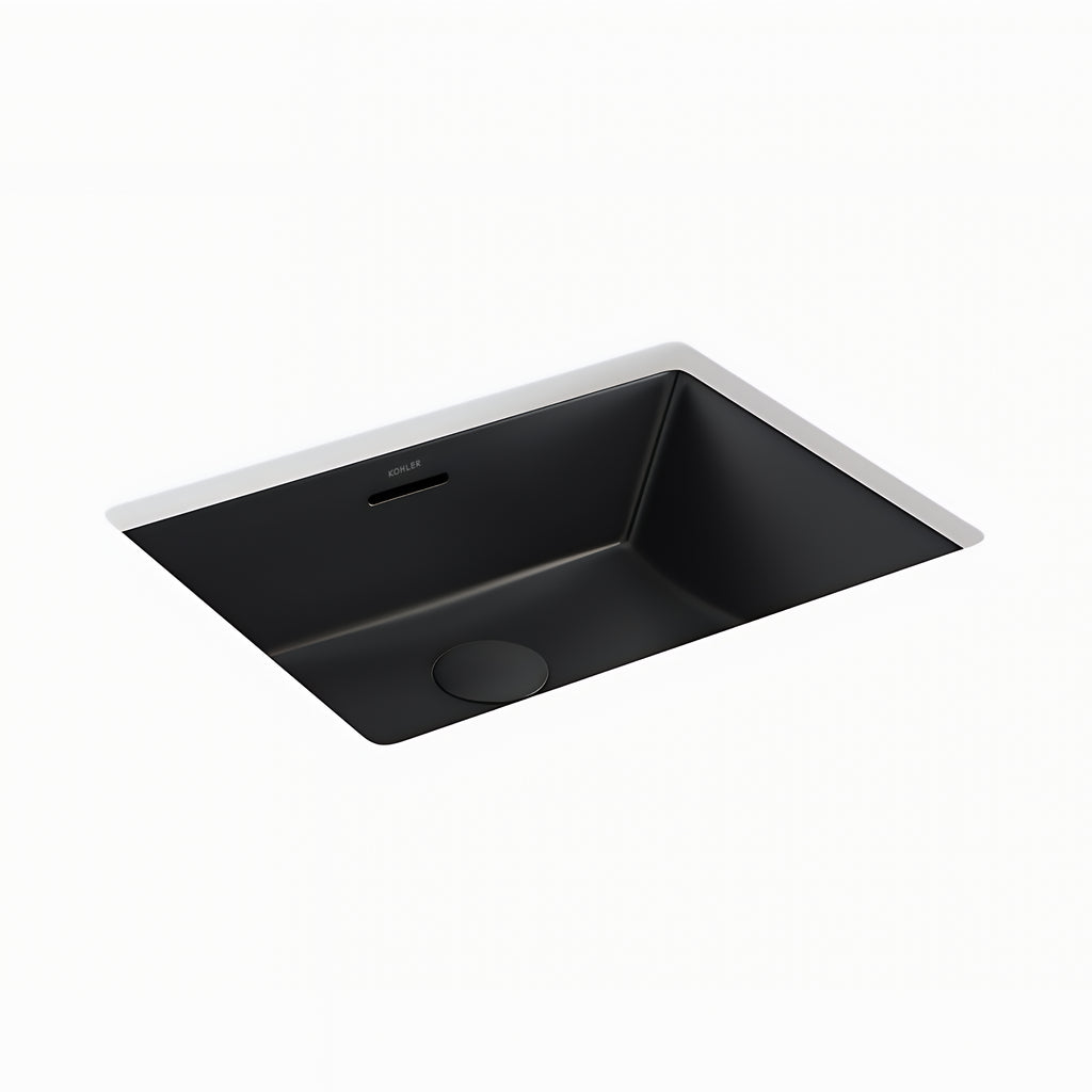 The Kohler Brazn Under Counter Basin in Honed Black 540mm combines elegance with modern functionality. Crafted from durable vitreous china, this rectangular basin is designed for seamless under-counter installation with a sleek, overflow-equipped center drain. Measuring 540mm x 417mm x 184mm, it features no faucet holes, supporting wall- or counter-mount faucets. Complete with a brass drain and color-matched cover, it includes a cut-out template and clamp pack. Also available in White, backed by a 10-year warranty.