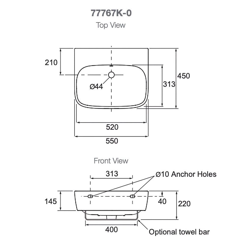 The Kohler ModernLife Wall Hung Basin in White 550mm is a sleek, rectangular basin designed to elevate modern bathrooms. Crafted from durable vitreous china, it measures 550mm x 450mm x 220mm and features Kohler’s CleanCoat technology for easy-to-clean surfaces. With a 12 L/min capacity and overflow functionality, this 18kg basin offers practicality and style. Wall-hung installation maximizes space, while the 10-year ceramic warranty ensures lasting quality. Waste not included; requires 32mm waste (with overflow).