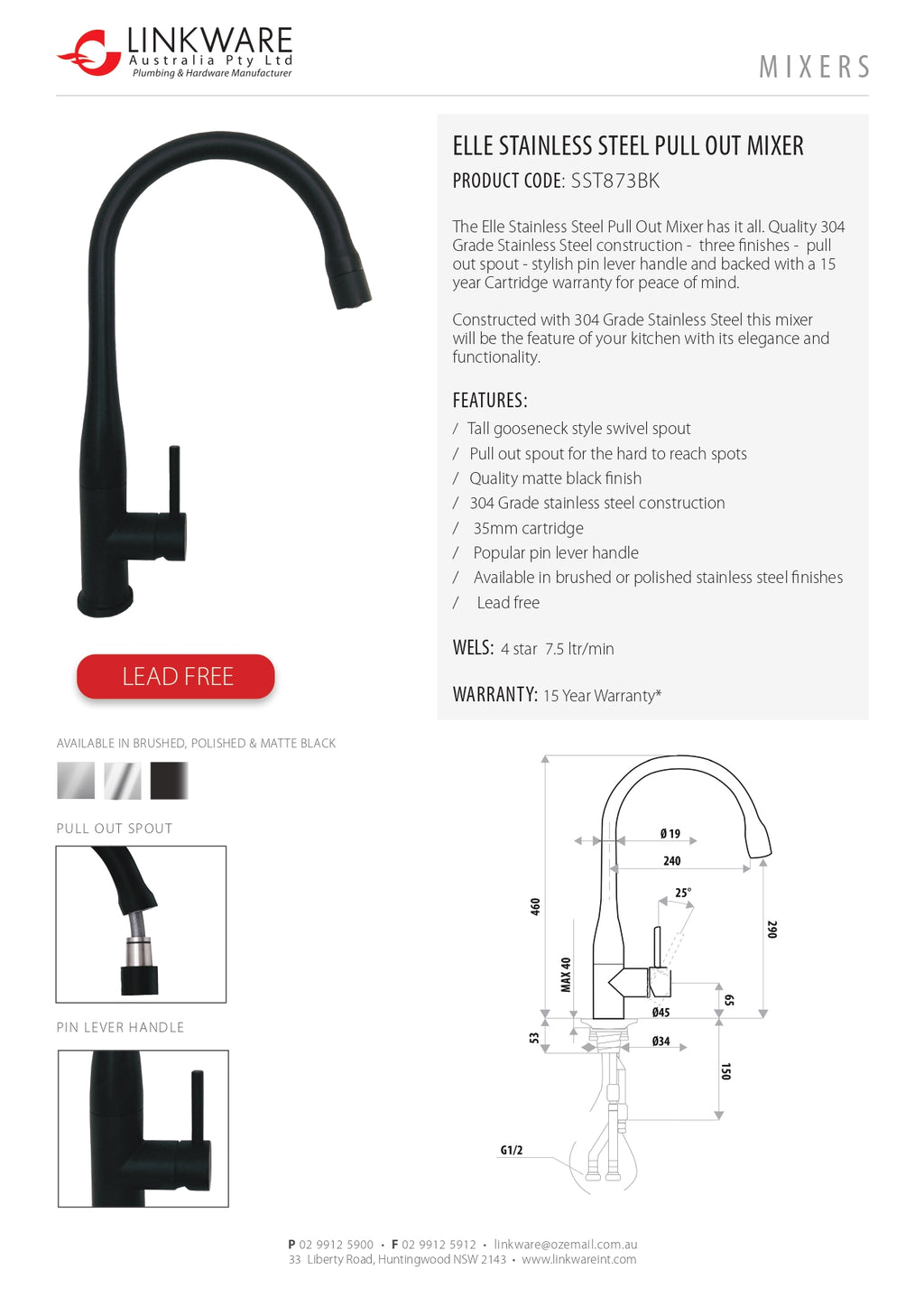 Introducing the Linkware Elle Steel Pull out Mixer in striking Matte Black, a sophisticated addition to your bathroom. Available in Brushed Stainless and Chrome, this versatile fixture adds a touch of modern elegance to any space. With a 15-year residential warranty, enjoy the first 2 years with comprehensive parts and labor coverage against manufacturing faults. From years 3 to 5, we offer a replacement parts warranty, and from years 3 to 15, you'll have peace of mind with a replacement-only ceramic disc cartridge warranty. The mixer inlet hoses are also covered under the manufacturer's mixer warranty, ensuring quality and reliability. Elevate your bathroom with Linkware Elle today!