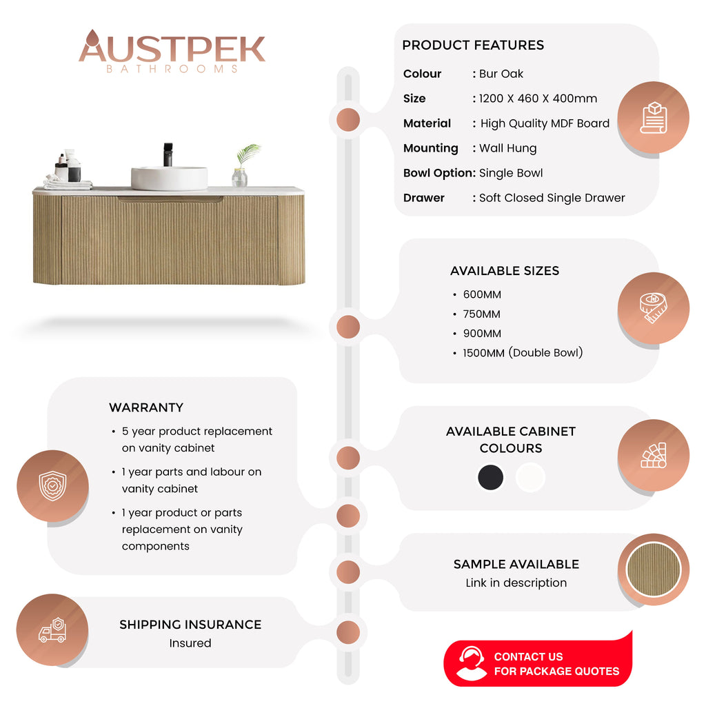 The Mercio Rome Fluted Wall Hung Vanity, known for its bespoke design and craftsmanship, comes in sizes 600mm, 750mm, 900mm, and 1200mm with a single bowl, and a 1500mm version with a double bowl. Constructed from high-quality MDF board, it features a sleek, handle-less appearance with a durable DTC Finger Pull mechanism. Available in Bur Oak, Matte Black, and Matte White, it offers ample storage and modern aesthetics. The vanity includes a 5-year replacement warranty for the cabinet, 1-year parts and labour coverage on the cabinet, and a 1-year replacement warranty on vanity components.