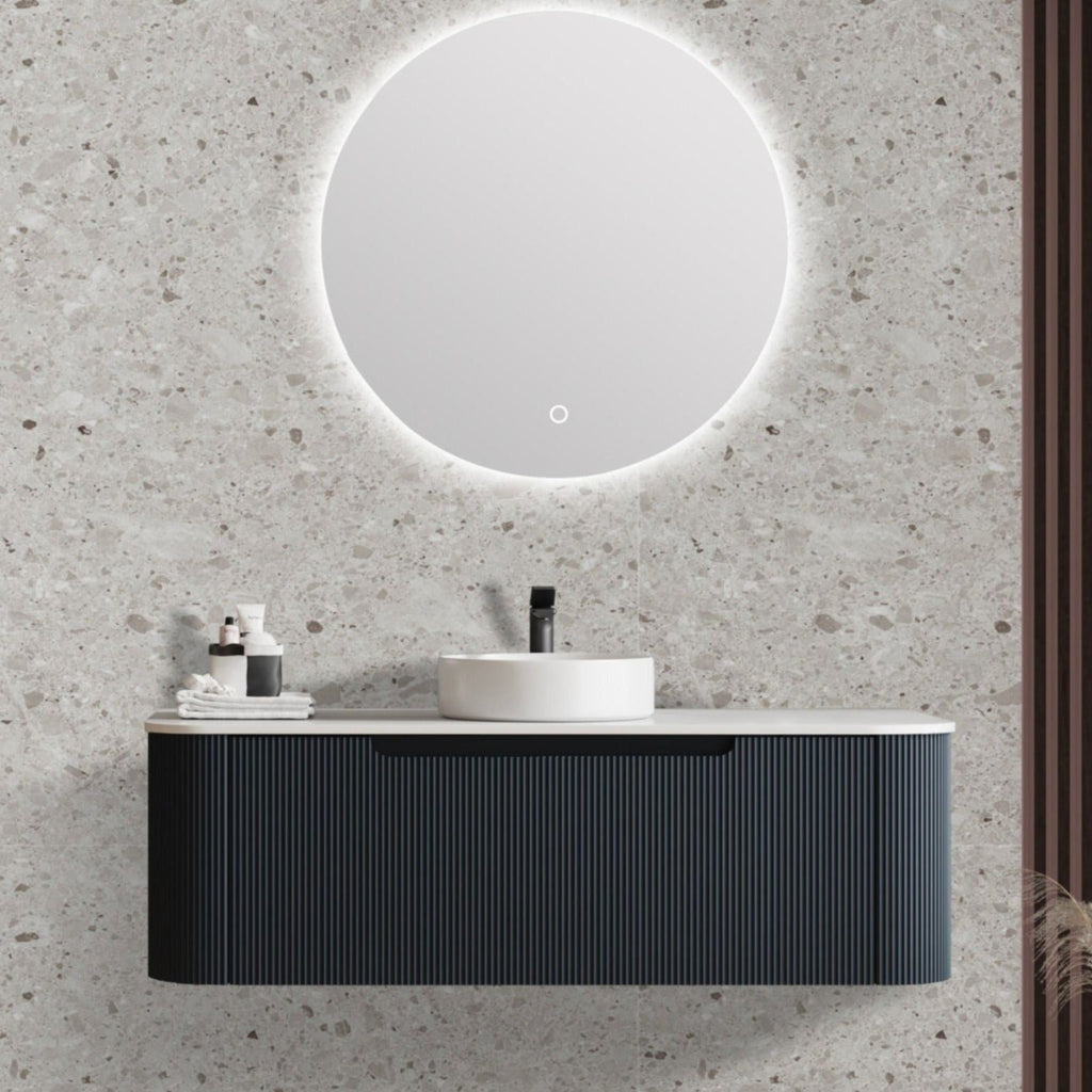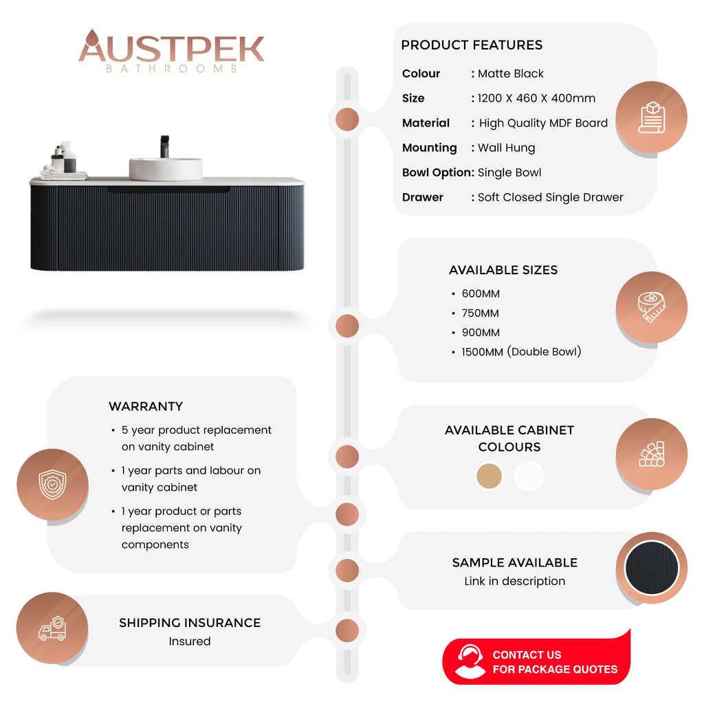 The Mercio Rome Fluted Wall Hung Vanity, known for its bespoke design and craftsmanship, comes in sizes 600mm, 750mm, 900mm, and 1200mm with a single bowl, and a 1500mm version with a double bowl. Constructed from high-quality MDF board, it features a sleek, handle-less appearance with a durable DTC Finger Pull mechanism. Available in Bur Oak, Matte Black, and Matte White, it offers ample storage and modern aesthetics. The vanity includes a 5-year replacement warranty for the cabinet, 1-year parts and labour coverage on the cabinet, and a 1-year replacement warranty on vanity components.