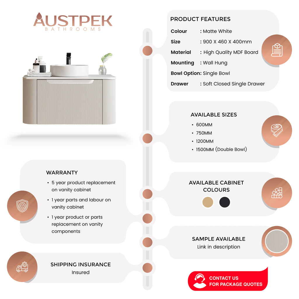 The Mercio Rome Fluted Wall Hung Vanity, known for its bespoke design and craftsmanship, comes in sizes 600mm, 750mm, 900mm, and 1200mm with a single bowl, and a 1500mm version with a double bowl. Constructed from high-quality MDF board, it features a sleek, handle-less appearance with a durable DTC Finger Pull mechanism. Available in Bur Oak, Matte Black, and Matte White, it offers ample storage and modern aesthetics. The vanity includes a 5-year replacement warranty for the cabinet, 1-year parts and labour coverage on the cabinet, and a 1-year replacement warranty on vanity components.