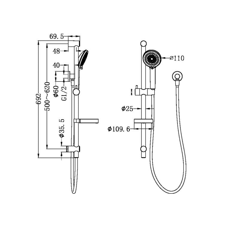 The Nero Builder Project Shower Rail 692mm delivers reliable performance with a clean, modern design suited to everyday bathroom installations. Crafted from solid brass with a durable satin-smooth hose, it features a height-adjustable handset slider and an adjustable bottom pillar for easy retrofit installations. Available in Chrome and Matte Black, it includes a 10-year replacement warranty on finishes, 10 years replacement only on hand showers and hoses, and 1 year parts and labour coverage.